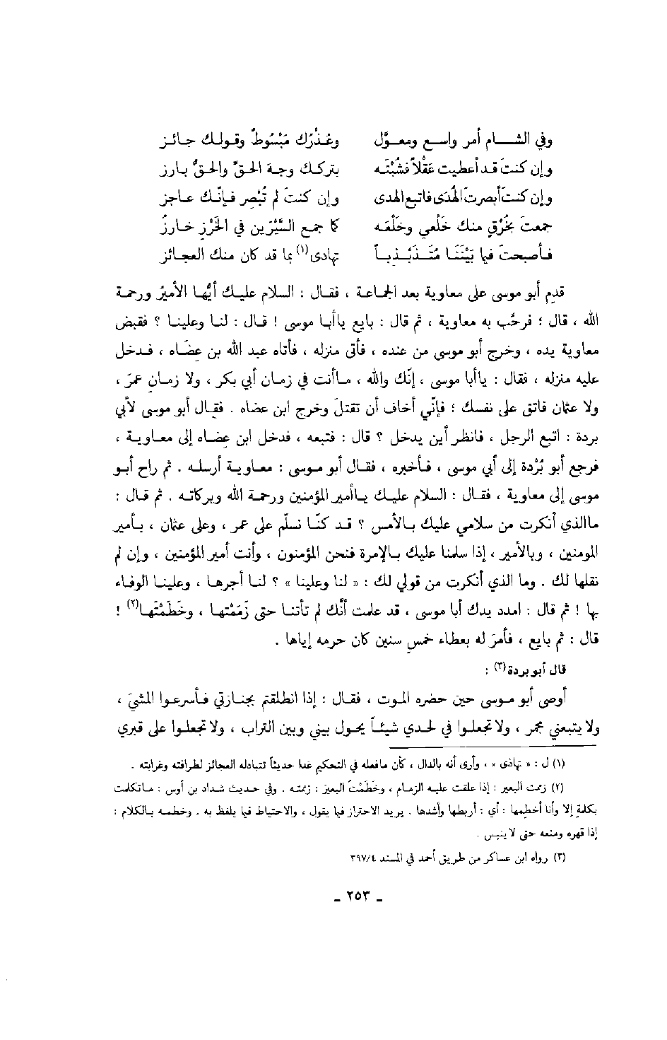قدم أبو موسى على معاوية بعد الجماعة، فقال: السلام عليك أيها الأمير ورحمة الله، قال: فرحب به معاوية؛ ثم قال: بايع يا أبا موسى، قال: لنا وعلينا؟ فقبض معاوية يده، وخرج أبو موسى من عنده، فأتى منزله، فأتاه عبد الله بن عضاه، فدخل عليه منزله، فقال: يا أبا موسى إنك والله ما أنت في زمان أبي بكر، ولا زمان عمر، ولا عثمان، فاتق على نفسك؛ فإني أخاف أن تقتل، وخرج ابن عضاه، فقال أبو موسى لأبي بردة: اتبع الرجل، فانظر أين يدخل؟ قال: فتبعه، فدخل ابن عضاه إلى معاوية، فرجع أبو بردة إلى أبي موسى، فأخبره، فقال أبو موسى: معاوية أرسله، ثم راح أبو موسى إلى معاوية، فقال: السلام عليك يا أمير المؤمنين ورحمة الله وبركاته، ثم قال: ما الذي أنكرت من سلامي عليك بالأمس؟ قد كنا نسلم على عمر، وعلى عثمان بأمير المؤمنين، وبالأمير، إذا سلمنا عليك بالإمرة فنحن المؤمنون، وأنت أمير المؤمنين، وإن لم نقلها لك، وما الذي أنكرت من قولي لك: لنا وعلينا؟ لنا أجرها، وعلينا الوفاء بها! ثم قال: امدد يدك يا أبا موسى، قد علمت أنك لم تأتنا حتى زممتها، وخطمتها! قال: ثم بايع، فأمر له بعطاء خمس سنين كان حرمه إياها.
