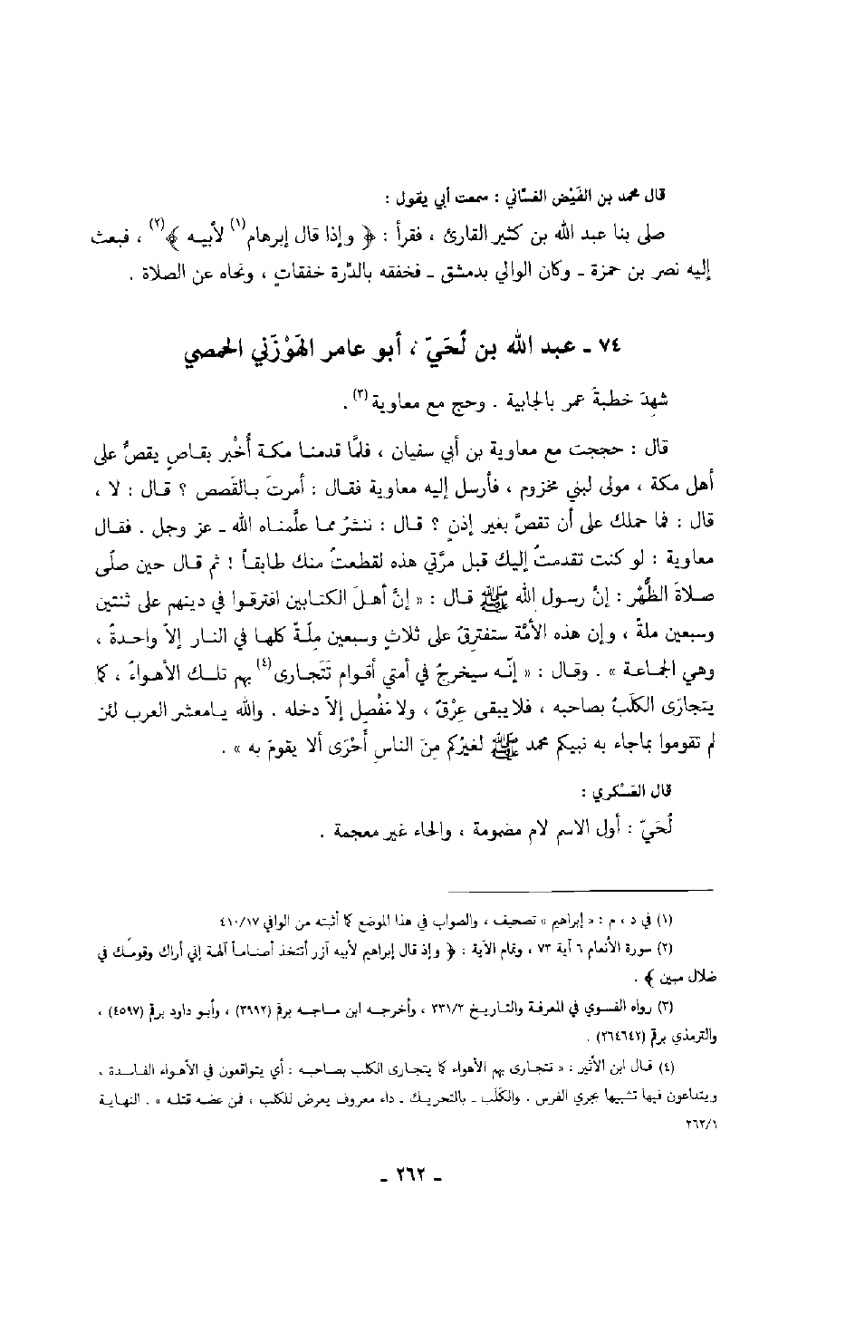 قال: حججت مع معاوية بن أبي سفيان فلما قدمنا مكة أخبر بقاصٍ يقص على أهل مكة، مولى لبني مخزوم، فأرسل إليه معاوية فقال: أمرت بالقصص؟ قال: لا، قال: فما حملك على أن تقص بغير إذنٍ؟ قال: ننشر مما علَّمناه الله عز وجل، فقال معاوية: لو كنت تقدمتُ إليك من قبل مرَّتي هذه لقطعت منك طابقاً! ثم قال حين صلى صلاة الظهر: إن رسول الله صَلَّى اللهُ عَلَيْهِ وَسَلَّمَ قال: " إن أهل الكتابين افترقوا في دينهم على ثنتين وسبعين ملةً، وإن هذه الأمة ستفترق على ثلاثٍ وسبعين ملةً كلها في النار إلا واحدةً، وهي الجماعة " وقال: " إنه سيخرج في أمتي أقوام تتجارى بهم تلك الأهواء، كما يتجارى الكلب بصاحبه، فلا يبقى عرق، ولا مفصل إلا دخله، والله يا معشر العرب لئن لم تقوموا بما جاء به نبيكم محمد صَلَّى اللهُ عَلَيْهِ وَسَلَّمَ لغيركم من الناس أحرى ألا يقوم به ".