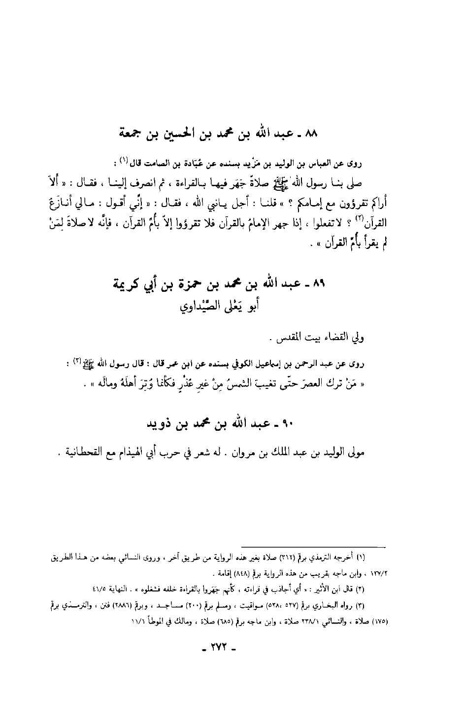 روى عن العباس بن الوليد بن مزيد بسنده عن عبادة بن الصامت قال: صلى بنا رسول الله صَلَّى اللهُ عَلَيْهِ وَسَلَّمَ صلاةً جهر فيها بالقراءة، ثم انصرف إلينا، فقال: " ألا أراكم تقرؤون مع إمامكم؟ " قلنا: أجل يا نبي الله، فقال: " إني أقول: ما لي أنازع القرآن؟ لا تفعلوا إذا جهر الإمام بالقرآن فلا تقرؤوا إلا بأم القرآن، فإنه لا صلاة لمن لم يقرأ بأم القرآن ".