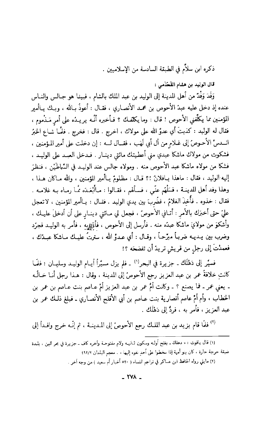 وفَد وفْد من أهل المدينة إلى الوليد بن عبد الملك بالشام، فبينما هو جالس والناس عنده إذ دخل عليه عبد الأحوص بن محمد الأنصاري، فقال: أعوذ بالله، وبك يا أمير المؤمنين مما يكلفني الأحوص! قال: وما يكلفك؟ فأخبره أنه يريده على أمرٍ مذموم، فقال له الوليد: كذبت أي عدو الله على مولاك، اخرج قال: فخرج، فلما شاع الخبر اندس الأحوص إلى غلامٍ من آل أبي لهب، فقال له: إن دخلت على أمير المؤمنين، فشكوت من مولاك ما شكا عبدي مني أعطيتك مائتي دينار، فدخل العبد على الوليد، فشكا من مولاه ما شكا عبد الأحوص منه، ومولاه جالس عند الوليد في السماطين، فنظر إليه الوليد، فقال: ما هذا يا فلان!؟ قال: مظلوم يا أمير المؤمنين، والله ما كان هذا، وهذا وفد أهل المدينة، فسلهم عني، فسألهم، فقالوا: ما أبعده مما رماه به غلامه. فقال: خذوه فأُخذ الغلام فضُرب بين يدي الوليد، فقال: يا أمير المؤمنين، لا تعجل عليّ حتى أخبرك بالأمر: أتاني الأحوص، فجعل لي مائتي دينارٍ على أن أدخل عليك، وأشكو من مولاي ما شكا عبده منه، فأرسل إلى الأحوص فأتى به، فأمر به الوليد فجرد وضرب بين يديه ضرباً مبرحاً، وقال: أي عدو الله، سترت عليك ما شكا عبدك، فعمدت إلى رجلٍ من قريشٍ تريد أن تفضحه؟! فسُيّر إلى دَهْلك - جزيرة في البحر - فلم يزل مسيراً أيام الوليد وسليمان؛ فلما كانت خلافة عمر بن عبد العزيز رجع الأحوص إلى المدينة، وقال: هذا رجل أنا خاله - يعني عمر - فما يصنع؟ - وكانت أم عمر بن عبد العزيز أم عاصم بنت عاصم بن عمر بن الخطاب، وأم أم عاصم أنصارية بنت عاصم بن أبي الأقلح الأنصاري - فبلغ ذلك عمر بن عبد العزيز فأمر به فرد إلى دهلك.