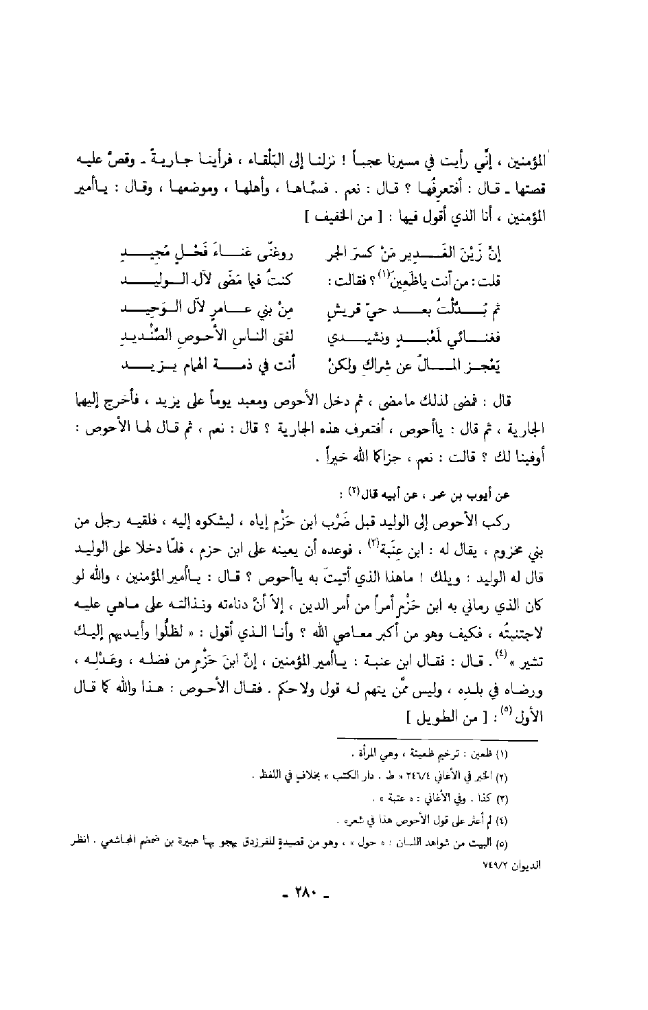 عن أيوب بن عمر، عن أبيه قال: ركب الأحوص إلى الوليد قبل ضرب ابن حزم إياه، ليشكوه إليه، فلقيه رجل من بني مخزوم، يقال له: ابن عنبة، فوعده أن يعينه على ابن حزم، فلما دخلا على الوليد قال له الوليد: ويلك! ما هذا الذي أتيت به يا أحوص؟ قال: يا أمير المؤمنين، والله لو كان الذي رماني به ابن حزمٍ أمراً من أمر الدين، إلا أن دناءته ونذالته على ما هي عليه لاجتنبته، فكيف وهو من أكبر معاصي الله؟ وأنا الذي أقول: " لظلوا وأيديهم إليك تشير " قال: فقال ابن عنبة: يا أمير المؤمنين، إن ابن حزمٍ من فضله، وعدله، ورضاه في بلده، وليس ممن يتهم له قول ولا حكم، فقال الأحوص: هذا والله كما قال الأول: من الطويل