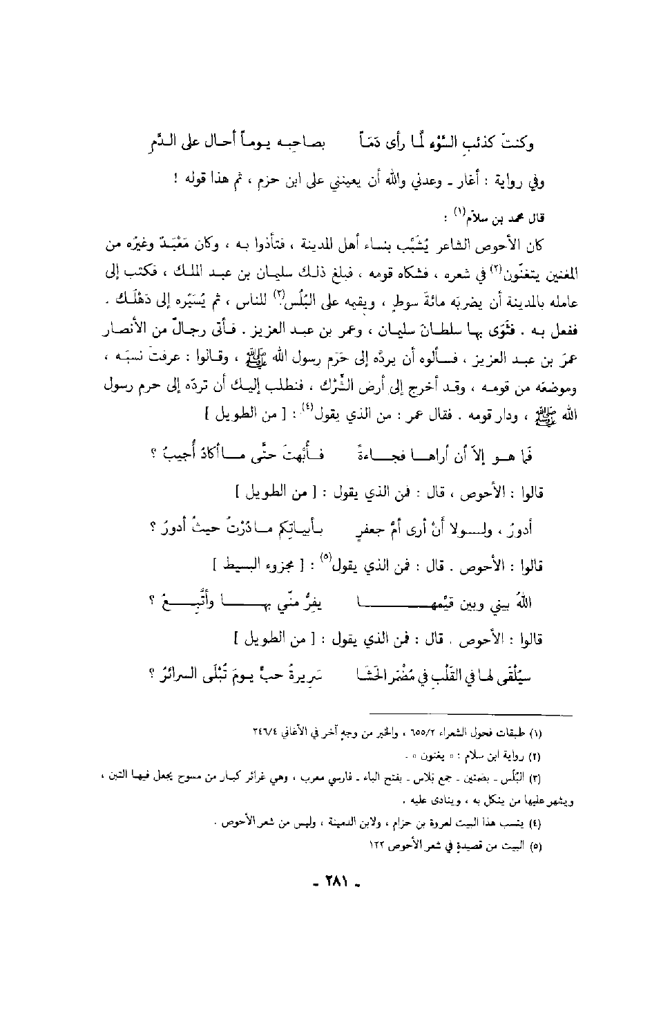 وفي رواية: أغار - وعدني والله أن يعينني على ابن حزم ثم هذا قوله! قال محمد بن سلام: كان الأحوص الشاعر يشبب بنساء أهل المدينة، فتأذوا به، وكان معبد وغيره من المغنين يتغنون في شعره، فشكاه قومه، فبلغ ذلك سليمان بن عبد الملك، فكتب إلى عامله بالمدينة أن يضربه مائة سوطٍ، ويقيمه على البلس للناس، ثم يسيره إلى دهلك. ففعل به. فثوى بها سلطان سليمان، وعمر بن عبد العزيز، فأتى رجال من الأنصار عمر بن عبد العزيز، فسألوه أن يرده إلى حرم رسول الله صَلَّى اللهُ عَلَيْهِ وَسَلَّمَ، وقالوا: عرفت نسبه، وموضعه من قومه، وقد أخرج إلى أرض الشرك، فنطلب إليك أن ترده إلى حرم رسول الله صَلَّى اللهُ عَلَيْهِ وَسَلَّمَ ودار قومه، فقال عمر: من الذي يقول: من الطويل