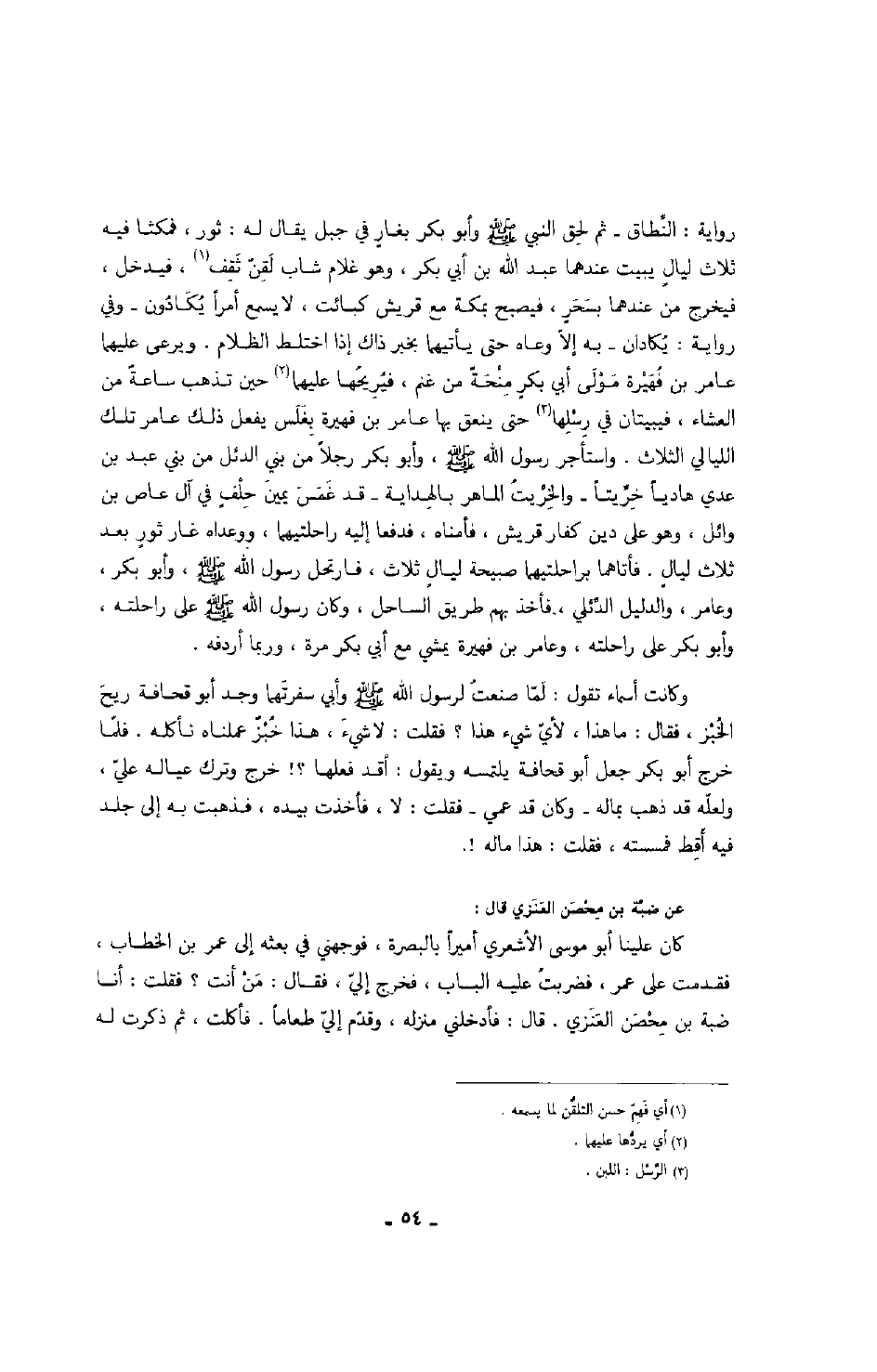 رواية: النطاق - ثم لحق النبي صَلَّى اللهُ عَلَيْهِ وَسَلَّمَ وأبو بكر بغارٍ في جبل يقال له ثور، فمكثا فيه ثلاث ليالٍ يبيت عندهما عبد الله بن أبي بكر، وهو غلام شاب لقن ثقف، فيدخل، فيخرج من عندهما بسحرٍ، فيصبح بمكة مع قريش كبائت، لا يسمع أمراً يُكادون - وفي رواية: يُكادان - به إلا وعاه حتى يأتيهما بخبر ذاك إذا اختلط الظلام، ويرعى عليهما عامر بن فهيرة مولى أبي بكر منحةً من غنم، فيريحها عليهما حين تذهب ساعةً من العشاء، فيبيتان في رسلها حتى ينعق بها عامر بن فهيرة بغلس يفعل ذلك عامر تلك الليالي الثلاث، واستأجر رسول الله صَلَّى اللهُ عَلَيْهِ وَسَلَّمَ، وأبو بكر رجلاً من بني الدئل من بني عبد بن عدي هادياً خريتاً - والخريت الماهر بالهداية - قد غمس يمين حلفٍ في آل عاص بن وائل، وهو على دين كفار قريش، فأمناه، فدفعا إليه راحلتيهما، ووعداه غار ثورٍ بعد ثلاث ليالٍ، فأتاهما براحلتيهما صبيحة ليالٍ ثلاث، فارتحل رسول الله صَلَّى اللهُ عَلَيْهِ وَسَلَّمَ، وأبو بكر، وعامر، والدليل الدئلي، فأخذ بهم طريق الساحل، وكان رسول الله صَلَّى اللهُ عَلَيْهِ وَسَلَّمَ على راحلته، وأبو بكر على راحلته، وعامر ابن فهيرة يمشي مع أبي بكر مرة، وربما أردفه.