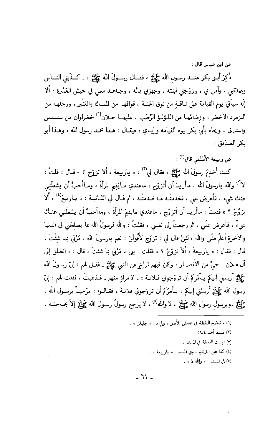 عن ربيعة الأسلمي قال: كنت أخدم رسول الله صَلَّى اللهُ عَلَيْهِ وَسَلَّمَ فقال لي: " يا ربيعة ألا تزوج؟ " قال: قلت: لا والله يا رسول الله، ما أريد أن أتزوج، ما عندي ما يقيم المرأة، وما احب أن يشغلني عنك شيء، فأعرض عني، فخدمته ما خدمته، ثم قال لي الثانية: " يا ربيع ألا تزوج؟ " فقلت: ما أريد أن أتزوج ما عندي ما يقيم المرأة، وما أحب أن يشغلني عنك شيء، فأعرض عني، ثم رجعت إلى نفسي، فقلت: والله لرسول الله بما يصلحني في الدنيا والآخرة أعلم مني والله، لئن قال لي: تزوج لأقولن: نعم يا رسول الله، مرني بما شئت. قال فقال: " يا ربيعة ألا تزوج؟ " فقلت: بلى مرني بما شئت، قال: " انطلق إلى آل فلان - حي من الأنصار، وكان فيهم تراخٍ عن النبي صَلَّى اللهُ عَلَيْهِ وَسَلَّمَ - فقل لهم: إن رسول الله صَلَّى اللهُ عَلَيْهِ وَسَلَّمَ أرسلني إليكم يأمركم أن تزوجوني فلانة - لامرأةٍ منهم - فذهبت، فقلت لهم: إن رسول الله صَلَّى اللهُ عَلَيْهِ وَسَلَّمَ أرسلني إليكم، يأمركم أن تزوجوني فلانة، فقالوا: مرحباً برسول الله صَلَّى اللهُ عَلَيْهِ وَسَلَّمَ، وبرسول رسول الله صَلَّى اللهُ عَلَيْهِ وَسَلَّمَ، لا والله، لا يرجع رسول رسول الله صَلَّى اللهُ عَلَيْهِ وَسَلَّمَ إلا بحاجته،