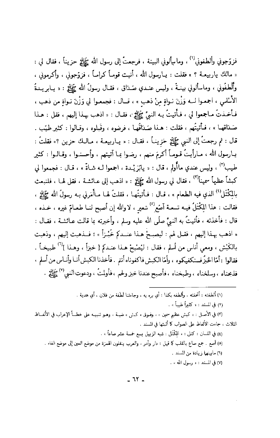 فزوجوني وألطفوني، وما سألوني البينة، فرجعت إلى رسول الله صَلَّى اللهُ عَلَيْهِ وَسَلَّمَ حزيناً، فقال لي: " مالك يا ربيعة؟ " فقلت: يا رسول الله، أتيت قوماً كراماً، فزوجوني وأكرموني وألطفوني وما سألوني بينة، وليس عندي صداق، فقال رسول الله صَلَّى اللهُ عَلَيْهِ وَسَلَّمَ: " يا بريدة الأسلمي، اجمعوا له وزن نواةٍ من ذهبٍ " قال: فجمعوا لي وزن نواةٍ من ذهب، فأخذت ما جمعوا لي، فأتيت به النبي صَلَّى اللهُ عَلَيْهِ وَسَلَّمَ فقال: " اذهب بهذا إليهم، فقل: هذا صداقها " فأتيتهم فقلت: هذا صداقها، فرضوه وقبلوه وقالوا: كثير طيب. قال: ثم رجعت إلى النبي صَلَّى اللهُ عَلَيْهِ وَسَلَّمَ حزيناً فقال: " يا ربيعة مالك حزين؟ " فقلت: يا رسول الله، ما رأيت قوماً أكرم منهم، رضوا بما آتيتهم، وأحسنوا وقالوا: كثير طيب وليس عندي ما أولم، قال: " يا بريدة، اجمعوا له شاة " قال: فجمعوا لي كبشاً عظيماً سميناً، فقال لي رسول الله صَلَّى اللهُ عَلَيْهِ وَسَلَّمَ: " اذهب إلى عائشة، فقل لها فلتبعث بالمكتل الذي فيه الطعام " قال: فأتيتها، فقلت لها ما أمرني به رسول الله صَلَّى اللهُ عَلَيْهِ وَسَلَّمَ، فقالت: هذا المكتل فيه تسعة آصع شعيرٍ، لا والله إن أصبح لنا طعام غيره، خذه، قال: فأخذته، فأتيت به النبي صَلَّى اللهُ عَلَيْهِ وَسَلَّمَ وأخبرته بما قالت عائشة، فقال: " اذهب بهذا إليهم، فقل لهم: ليصبح هذا عندكم خبزاً " فذهبت إليهم، وذهبت بالكبش ومعي أناس من أسلم، فقال: ليصبح هذا عندكم خبزاً، وهذا طبيخاً.