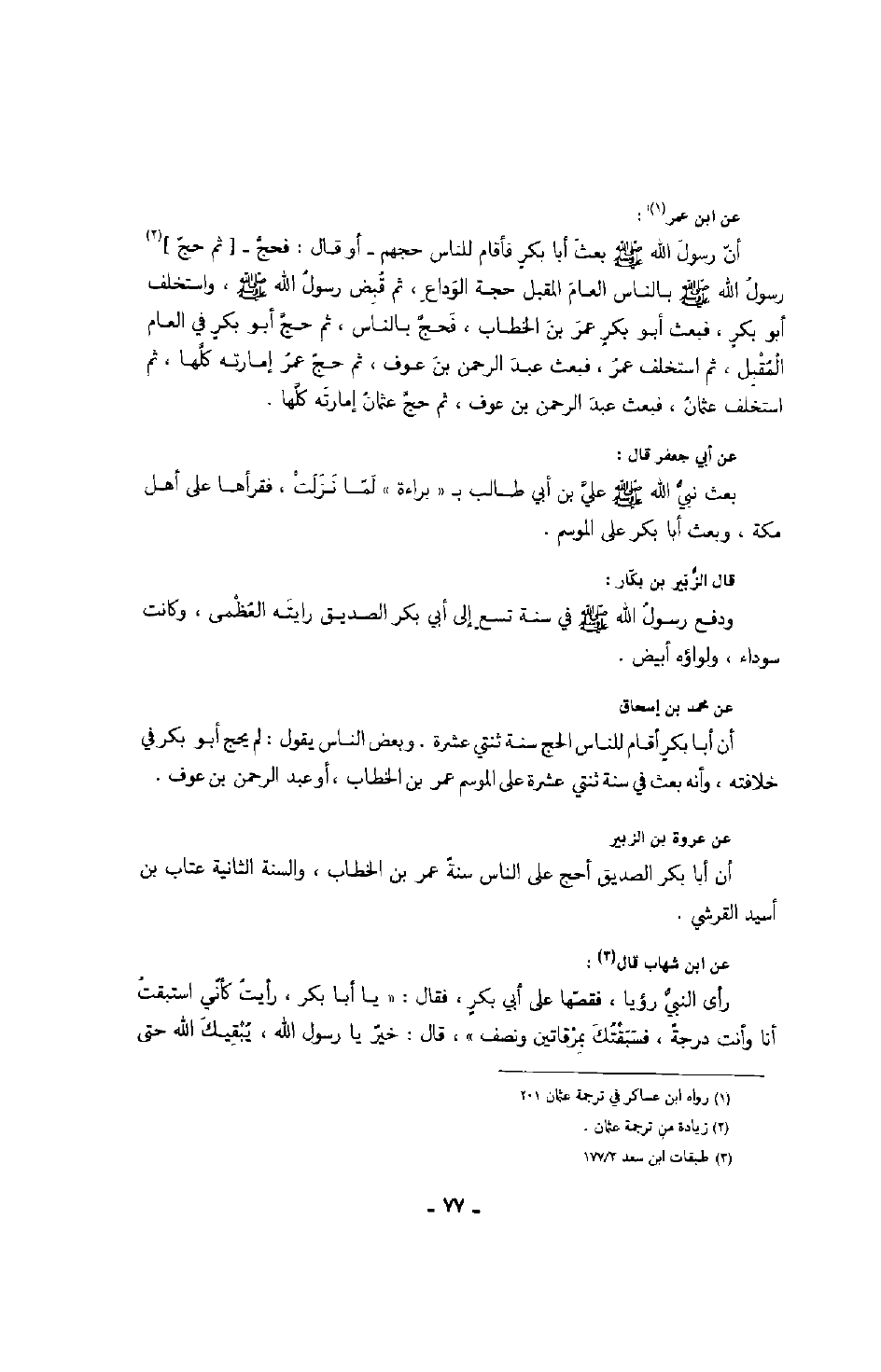 عن ابن عمر: أن رسول الله صَلَّى اللهُ عَلَيْهِ وَسَلَّمَ بعث أبا بكرٍ فأقام للناس حجهم - أو قال: فحج - ثم حج رسول الله صَلَّى اللهُ عَلَيْهِ وَسَلَّمَ بالناس العام المقبل حجة الوداع، ثم قبض رسول الله صَلَّى اللهُ عَلَيْهِ وَسَلَّمَ، واستخلف أبو بكرٍ، فبعث أبو بكرٍ عمر بن الخطاب، فحج بالناس، ثم حج أبو بكرٍ في العام المقبل، ثم استخلف عمر، فبعث عبد الرحمن بن عوف، ثم حج عمر إمارته كلها، ثم استخلف عثمان، فبعث عبد الرحمن بن عوف، ثم حج عثمان إمارته كلها.