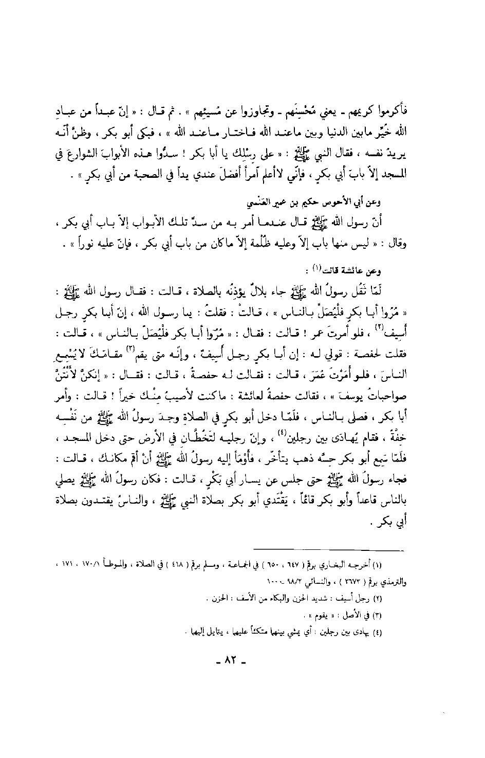 وعن عائشة قالت: لما ثَقُل رسول الله صَلَّى اللهُ عَلَيْهِ وَسَلَّمَ جاء بلال يؤذنه بالصلاة، قالت: فقال رسول الله صَلَّى اللهُ عَلَيْهِ وَسَلَّمَ: " مروا أبا بكرٍ فليصل بالناس " قالت: فقلت: يا رسول الله إن أبا بكرٍ رجل أسيف، فلو أمرت عمر! قالت: فقال: " مروا أبا بكر فليصل بالناس " قالت: فقلت لحفصة: قولي له: إن أبا بكر رجل أسيف، وإنه متى يقم مقامك لا يسمع الناس، فلو أمرت عمر، قالت: فقالت له حفصة، قالت: فقال: " إنكن لأنتن صواحبات يوسف " فقالت حفصة لعائشة: ما كنت لأصيب منك خيراً! قالت: وأمر أبا بكر فصلى بالناس، فلما دخل أبو بكرٍ في الصلاة وجد رسول الله صَلَّى اللهُ عَلَيْهِ وَسَلَّمَ من نفسه خِفةً، فقام يُهادى بين رجلين، وإن رجليه لتخُطان في الأرض حتى دخل المسجد، فلما سمع أبو بكر حسه ذهب يتأخر، فأومأ إليه رسول الله صَلَّى اللهُ عَلَيْهِ وَسَلَّمَ أن أقم مكانك، قالت: فجاء رسول الله صَلَّى اللهُ عَلَيْهِ وَسَلَّمَ حتى جلس عن يسار أبي بكرٍ، قالت: فكان رسول الله صَلَّى اللهُ عَلَيْهِ وَسَلَّمَ يصلي بالناس قاعداً وأبو بكر قائماً، يقتدي أبو بكر بصلاة النبي صَلَّى اللهُ عَلَيْهِ وَسَلَّمَ والناس يقتدون بصلاة أبي بكر.