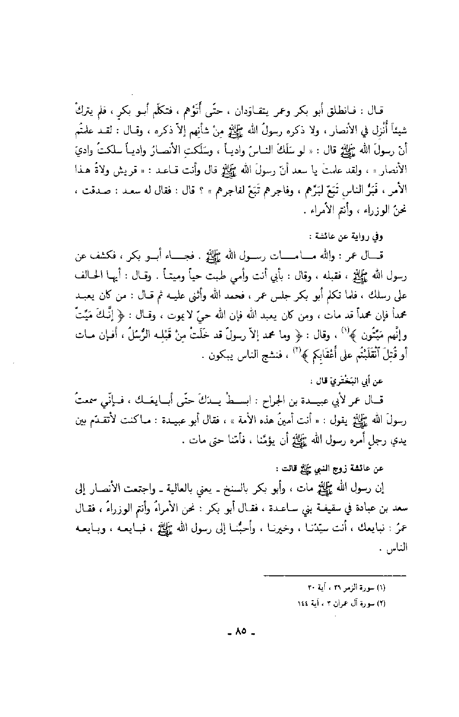 عن عائشة زوج النبي صَلَّى اللهُ عَلَيْهِ وَسَلَّمَ قالت: إن رسول الله صَلَّى اللهُ عَلَيْهِ وَسَلَّمَ مات، وأبو بكر بالسنخ - يعني بالعالية - واجتمعت الأنصار إلى سعد بن عبادة في سقيفة بني ساعدة، فقال أبو بكر: نحن الأمراء وأنتم الوزراء، فقال عمر: نبايعك، أنت سيدنا، وخيرنا وأحبنا إلى رسول الله صَلَّى اللهُ عَلَيْهِ وَسَلَّمَ، فبايعه وبايعه الناس.