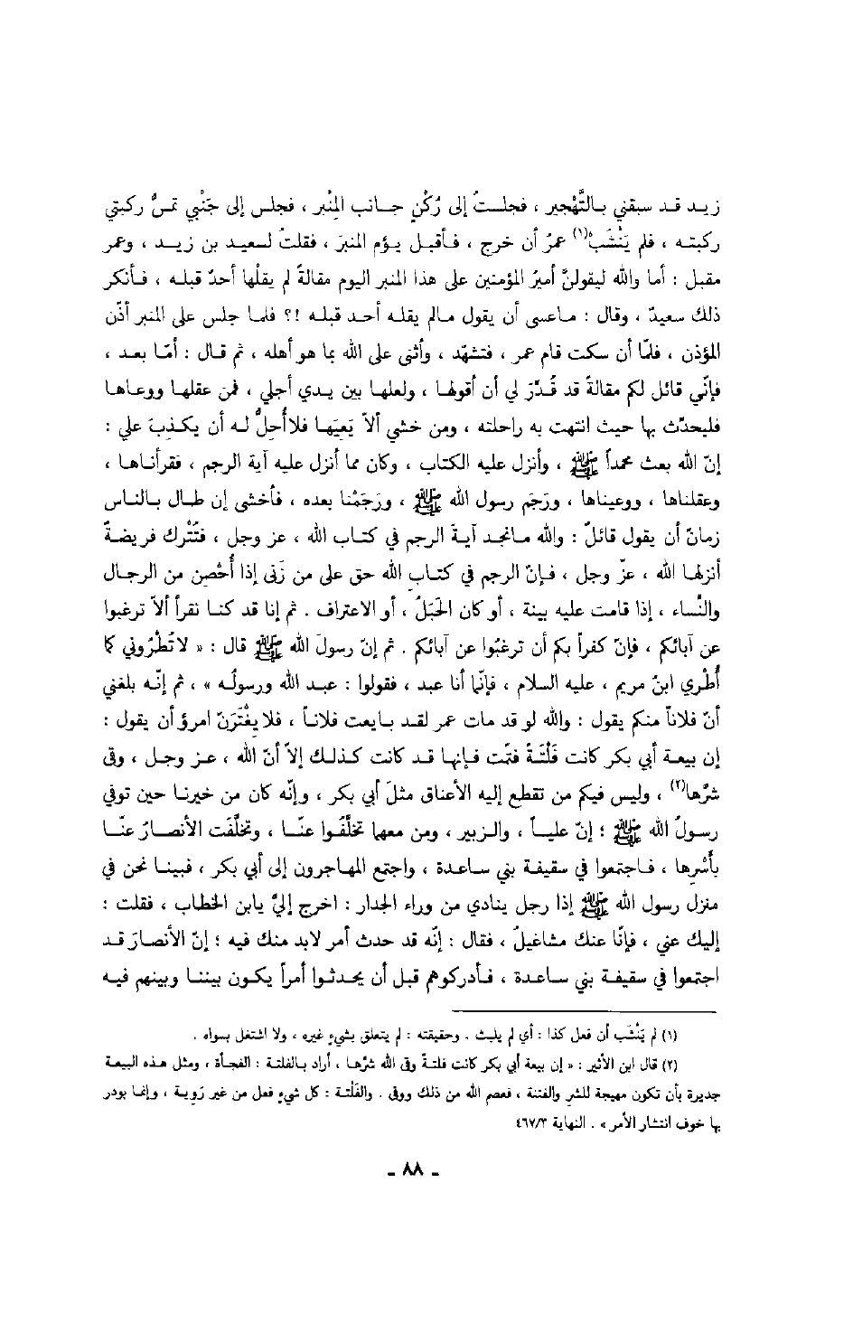 زيد قد سبقني بالتهجير، فجلست إلى ركنٍ جانب المنبر، فجلس إلى جنبي تمس ركبتي ركبته، فلم ينشب عمر أن خرج، فأقبل يوم المنبر، فقلت لسعيد بن زيد، وعمر مقبل: أما والله ليقولن أمير المؤمنين على هذا المنبر مقالةً لم يقلها أحد قبله، فأنكر ذلك سعيد، وقال: ما عسى أن يقول أحد قبله!؟ فلما جلس على المنبر أذّن المؤذن، فلما أن سكت قام عمر، فتشهد، وأثنى على الله بما هو أهله، ثم قال: أما بعد، فإني قائل لكم مقالة قد قُدِّر لي أن أقولها، ولعلها بين يدي أجلي، فمن عقلها ووعاها فليحدث بها حيث انتهت به راحلته، ومن خشي ألا يعيها فلا أحل له أن يكذب علي: إن الله بعث محمداً صَلَّى اللهُ عَلَيْهِ وَسَلَّمَ، وأنزل عليه الكتاب، وكان مما أنزل عليه آية الرجم، فقرأناها، وعقلناها، ووعيناها، ورجم رسول الله صَلَّى اللهُ عَلَيْهِ وَسَلَّمَ، ورجمنا بعده، فأخشى إن طال بالناس زمان أن يقول قائل: والله ما نجد آية الرجم في كتاب الله عز وجل، فتُترك فريضة أنزلها الله عز وجل، فإن الرجم في كتاب الله حق على من زنى إذا أُحصن من الرجال والنساء، إذا قامت عليه بينة، أو كان الحَبَل، أو الاعتراف، ثم إنا قد كنا نقرأ ألا ترغبوا عن آبائكم، فإن كفراً بكم أن ترغبوا عن آبائكم، ثم إن رسول الله صَلَّى اللهُ عَلَيْهِ وَسَلَّمَ قال: " لا تطروني كما أُطري ابن مريم عليه السلام، فإنما أنا عبد فقولوا: عبد الله ورسوله "، ثم إنه بلغني أن فلاناً منكم يقول: والله لو قد مات عمر لقد بايعت فلاناً، فلا يغترن امرؤ أن يقول: إن بيعة أبي بكر كانت فلتةً فتمت فإنها قد كانت كذلك إلا أن الله عز وجل وقى شرها، وليس فيكم من تقطع إليه الأعناق مثل أبي بكر، وإنه كان من خيرنا حين توفي رسول الله صَلَّى اللهُ عَلَيْهِ وَسَلَّمَ؛ إن علياً، والزبير، ومن معهما تخلفوا عنا، وتخلفت الأنصار عنا بأسرها، فاجتمعوا في سقيفة بني ساعدة، واجتمع المهاجرون إلى أبي بكر، فبينا نحن في منزل رسول الله صَلَّى اللهُ عَلَيْهِ وَسَلَّمَ إذا رجل ينادي من وراء الجدار: اخرج إلي يابن الخطاب، فقلت: إليك عني فإنا عنك مشاغيل، فقال: إنه قد حدث أمر لا بد منك فيه، إن الأنصار قد اجتمعوا في سقيفة بني ساعدة، فأدركوهم قبل أن يحدثوا أمراً يكون بيننا وبينهم فيه