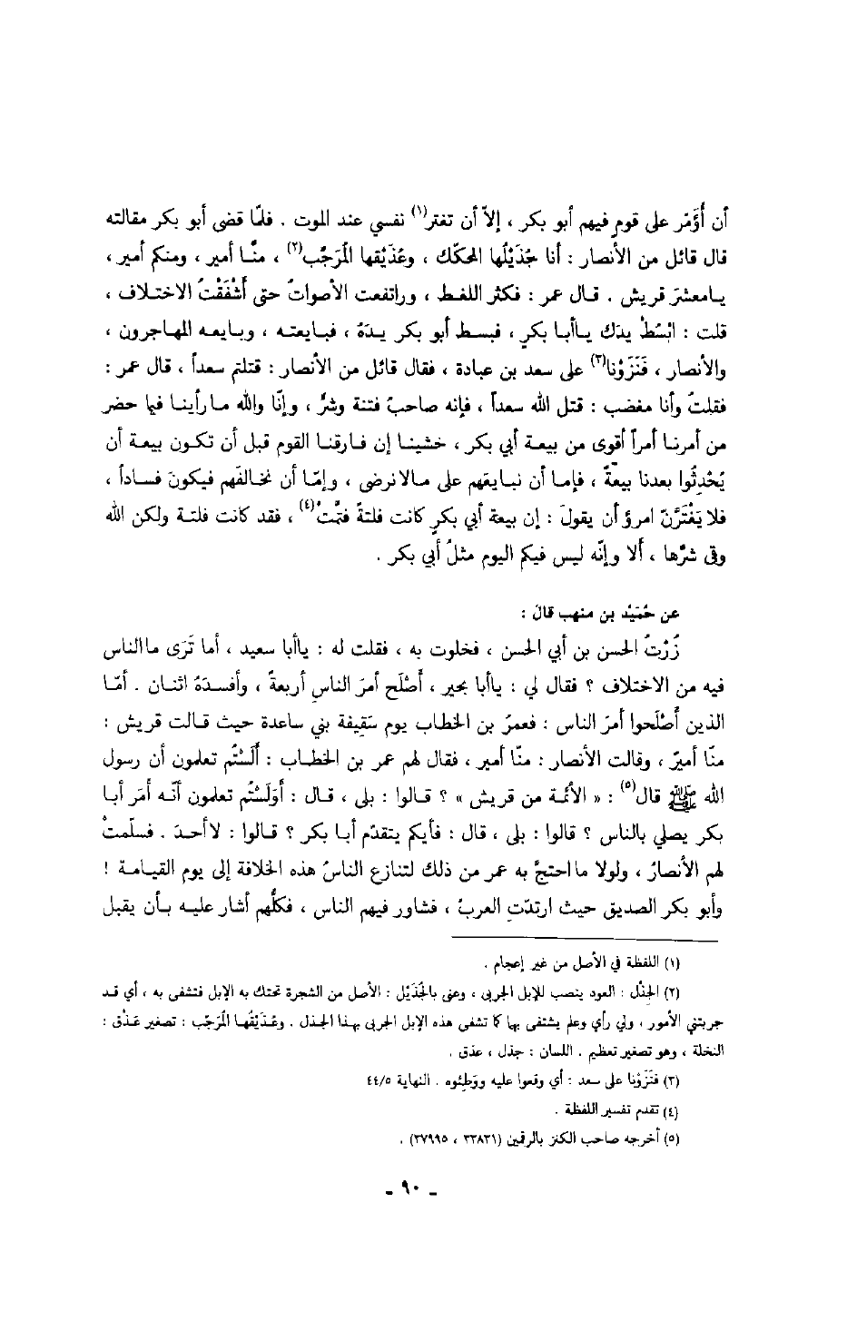 عن حميد بن منهب قال: زرت الحسن بن أبي الحسن، فخلوت به، فقلت له: يا أبا سعيد، أما ترى ما الناس فيه من الاختلاف؟ فقال لي: يا أبا بحير، أصلح أمر الناس أربعة، وأفسده اثنان، أما الذين أصلحوا أمر الناس: فعمر بن الخطاب يوم سقيفة ساعدة حيث قالت قريش: منا أمير، وقالت الأنصار: منا أمير، فقال لهم عمر بن الخطاب: ألستم تعلمون أن رسول الله صَلَّى اللهُ عَلَيْهِ وَسَلَّمَ قال: " الأئمة من قريش؟ " قالوا: بلى، قال: أولستم تعلمون أنه أمر أبا بكر يصلي بالناس؟ قالوا: بلى، قال: فأيكم يتقدم أبا بكر؟ قالوا: لا أحد، فسلمت لهم الأنصار، ولولا ما احتج به عمر من ذلك لتنازع الناس هذه الخلافة إلى يوم القيامة! وأبو بكر الصديق حيث ارتدت العرب، فشاور فيهم الناس، فكلهم أشار عليه بأن يقبل