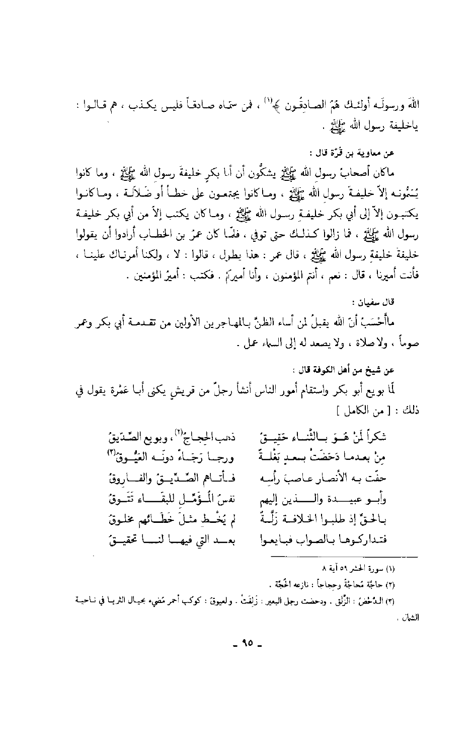 عن شيخ من أهل الكوفة قال: لما بويع أبو بكر واستقام أمور الناس أنشأ رجل من قريشٍ يكنى أبا عمرة يقول في ذلك: من الكامل