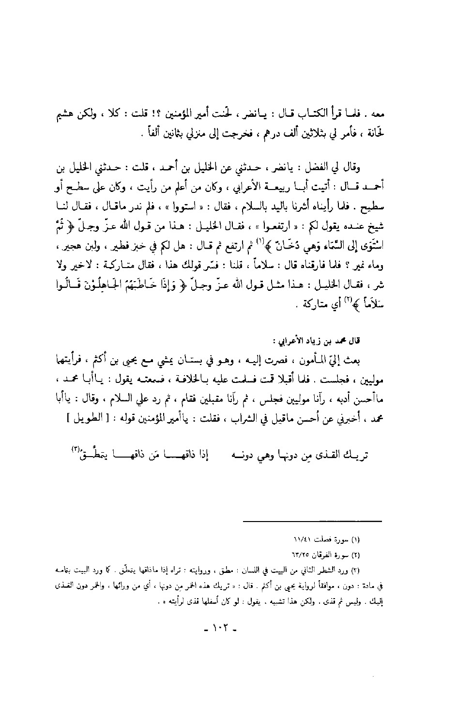 وقال لي الفضل: يا نضر، حدثني عن الخليل بن أحمد، قلت: حدثني الخليل بن أحمد قال: أتيت أبا ربيعة الأعرابي، وكان من اعلم من رأيت، وكان على سطح أو سطيح. فلما رأيناه أشرنا باليد بالسلام، فقال: استووا، فلم ندر ما قال، فقال لنا شيخ عنده يقول لكم: ارتفعوا، فقال الخليل: هذا من قول الله عز وجل " ثم استوى إلى السماء وهي دخان " ثم ارتفع ثم قال: هل لكم في خبز فطير، ولبن هجير، وماء نمير؟ فلما فارقناه قال: سلاماً، قلنا: فسر قولك هذا، فقال متاركة: لا خير ولا شر، فقال الخليل: هذا مثل قول الله عز وجل " وإذا خاطبهم الجاهلون قالوا سلاماً " أي متاركة.