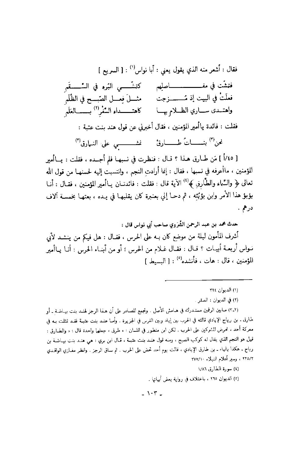 من طارق هذا؟ قال: فنظرت في نسبها فلم أجده، فقلت: يا أمير المؤمنين، ما اعرفه في نسبها، فقال: إنما أرادت النجم، وانتسبت إليه لحسنها من قول الله تعالى " والسماء والطارق " الآية قال: فقلت: فائدتان يا أمير المؤمنين، فقال: أنا بؤبؤ هذا الأمر وابن بؤبئه، ثم دحا إلي بعنبرة كان يقلبها في يده، بعتها بخمسة آلاف درهم.