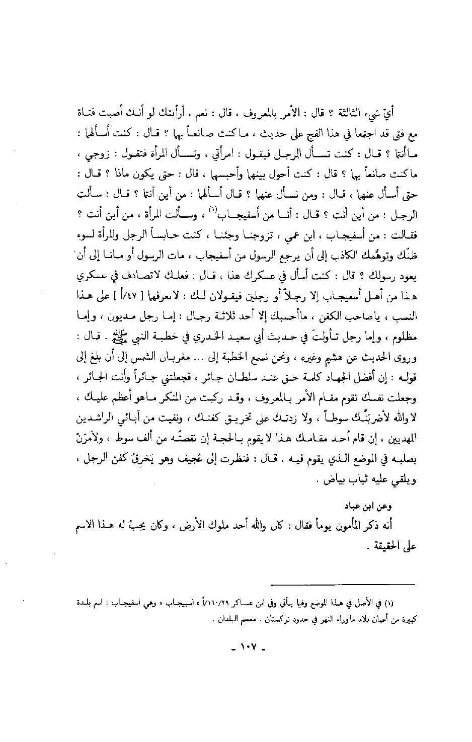 أي شيء الثالثة؟ قال: الأمر بالمعروف، قال: نعم، أرأيتك لو أنك أصبت فتاة مع فتى قد اجتمعا في هذا الفج على حديث، ما كنت صانعاً بهما؟ قال: كنت أسألهما: ما أنتما؟ قال: كنت تسأل الرجل فيقول: امرأتي، وتسأل المرأة فتقول: زوجي، ما كنت صانعاً بهما؟ قال: كنت أحول بينهما وأحبسهما، قال: حتى يكون ماذا؟ قال: حتى أسأل عنهما، قال: ومن تسأل عنهما؟ قال أسألهما: من أين أنتما؟ قال: سألت الرجل: من أين أنت؟ قال: أنا من أسفيجاب، وسألت المرأة، من أين أنت؟ فقالت: من أسفيجاب، ابن عمي، تزوجنا وجئنا، كنت حابساً الرجل والمرأة لسوء ظنك وتوهمك الكاذب إلى أن يرجع الرسول من أسفيجاب، مات الرسول أو ماتا إلى أن يعود رسولك؟ قال: كنت أسأل في عسكرك هذا، قال: فعلك لا تصادف في عسكري هذا من أهل أسفيجاب إلا رجلاً أو رجلين فيقولان لك: لا نعرفهما على هذا النسب، يا صاحب الكفن، ما احسبك إلا أحد ثلاثة رجال: إما رجل مديون، وإما مظلوم، وإما رجل تأولت في حديث أبي سعيد الخدري في خطبة النبي صَلَّى اللهُ عَلَيْهِ وَسَلَّمَ. قال: وروى الحديث عن هشيم وغيره، ونحن نسمع الخطبة إلى ... مغربان الشمس إلى أن بلغ إلى قوله: إن أفضل الجهاد كلمة حق عند سلطان جائر، فجعلتني جائراً وأنت الجائر، وجعلت نفسك تقوم مقام الأمر بالمعروف، وقد ركبت من المنكر ما هو أعظم عليك، لا والله لأضربنك سوطاً، ولا زدتك على تخريق كفنك، ونفيت من آبائي الراشدين المهديين، إن قام أحد مقامك هذا لا يقوم بالحجة إن نقصته من ألف سوط، ولآمرن بصَلَّى اللهُ عَلَيْهِ وَسَلَّمَى الله عليه وسلمى الله عليه وسلمبه في الموضع الذي يقوم فيه. قال: فنظرت إلى عجيف وهو يخرق كفن الرجل، ويلقي عليه ثياب بياض.