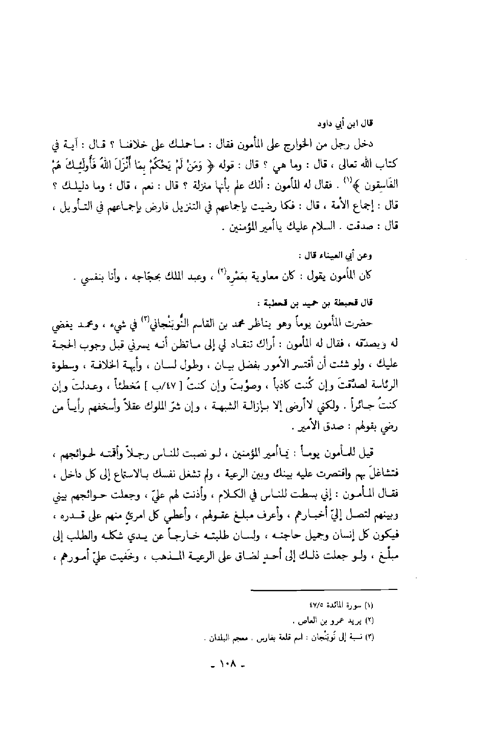 قال ابن أبي داود دخل رجل من الخوارج على المأمون فقال: ما حملك على خلافنا؟ قال: آية في كتاب الله تعالى، قال: وما هي؟ قال: قوله " ومن لم يحكم بما أنزل الله فأولئك هم الفاسقون ". فقال له المأمون: ألك علم بأنها منزلة؟ قال: نعم، قال؛ وما دليلك؟ قال: إجماع الأمة، قال: فكما رضيت بإجماعهم في التنزيل فارض بإجماعهم في التأويل، قال: صدقت. السلام عليك يا أمير المؤمنين.