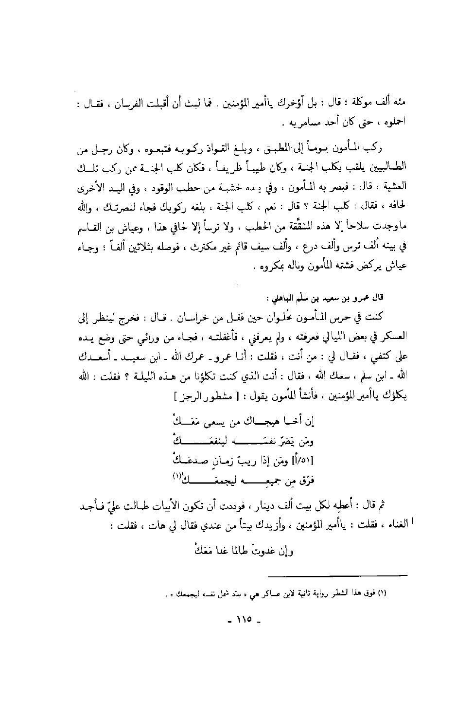 مئة ألف موكلة؛ قال: بل أؤخرك يا أمير المؤمنين. فما لبث أن أبلت الفرسان، فقال: احملوه، حتى كان أحد مسامريه.