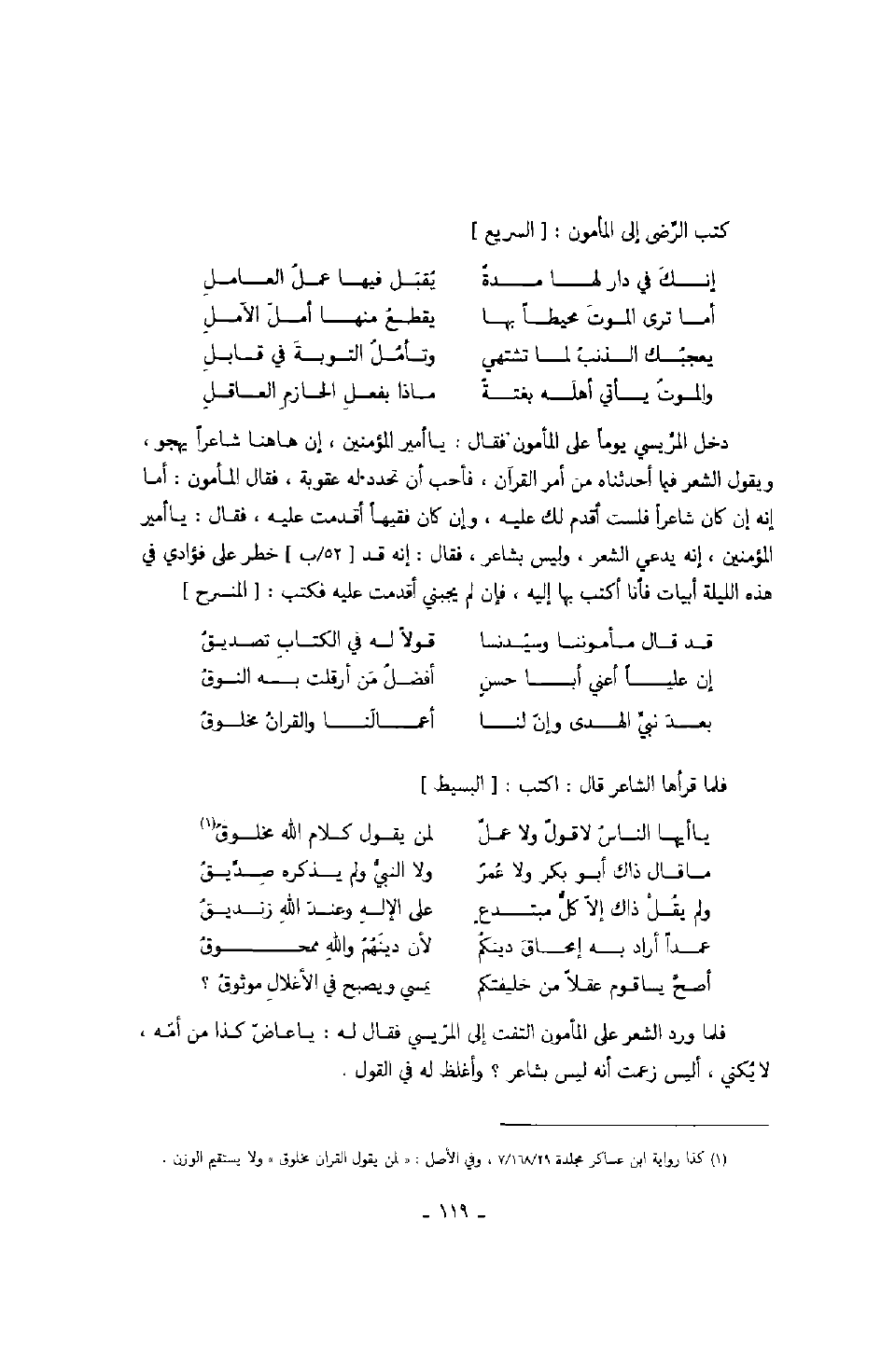 دخل المريسي يوماً على المأمون فقال: يا أمير المؤمنين، إن ها هنا شاعراً يهجو، ويقول الشعر فيما أحدثناه من أمر القرآن، فأحب أن تحدد له عقوبة، فقال المأمون: أما غنه إن كان شاعراً فلست أقدم لك عليه، وإن كان فقيهاً أقدمت عليه، فقال: يا أمير المؤمنين، إنه يدعي الشعر، وليس بشاعر، فقال: إنه قد خطر على فؤادي في هذه الليلة أبيات فأنا أكتب بها إليه، فإن لم يجبني أقدمت عليه فكتب: المنسرح