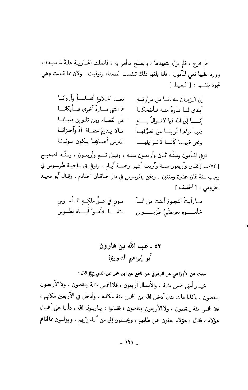 توفي المأمون وسنة ثمان وأربعون سنة، وقيل تسع وأربعون، وسنه الصحيح ثمان وأربعون سنة وأ؟ ربعة أشهر وخمسة أيام. وتوفي ناحية طرسوس في رجب سنة ثمان عشرة ومئتين. ودفن بطرسوس في دار خاقان الخادم. وقال أبو سعيد المخزومي: الخفيف