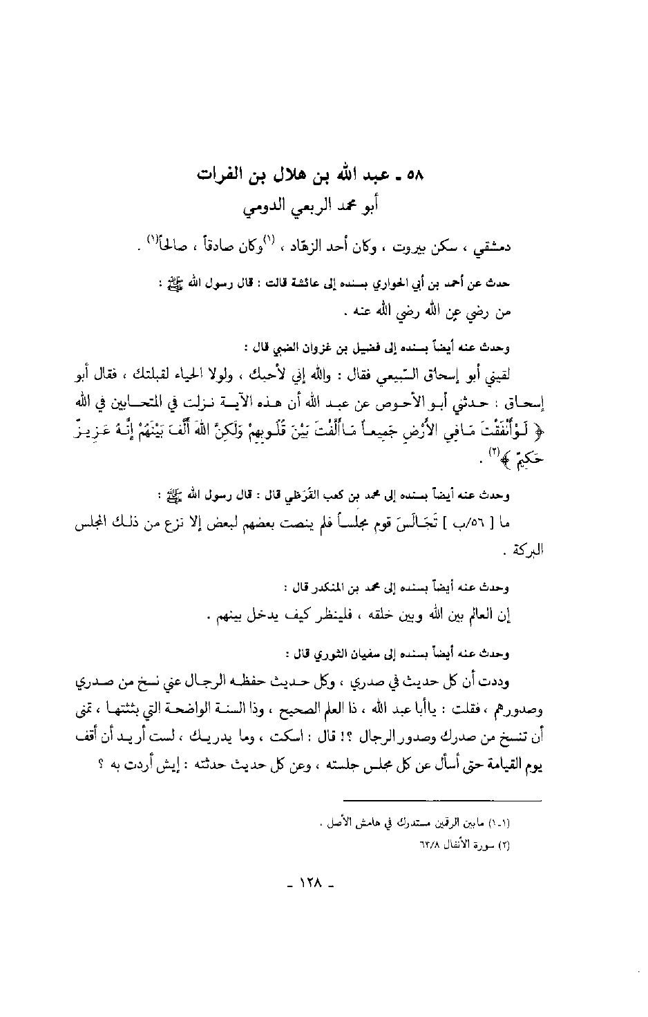 وحدث عنه أيضاً بسنده إلى فضيل بن غزوان الضبي قال: لقيني أبو إسحاق السبيعي فقال: والله إني لأحبك، ولولا الحياء لقبلتك، فقال أبو إسحاق: حدثني أبو الأحوص عن عبد الله أن هذه الآية نزلت في المتحابين في الله " لو أنفقت ما في الأرض جميعاً ما ألفت بين قلوبهم ولكن الله ألف بينهم إنه عزيز حكيم ".