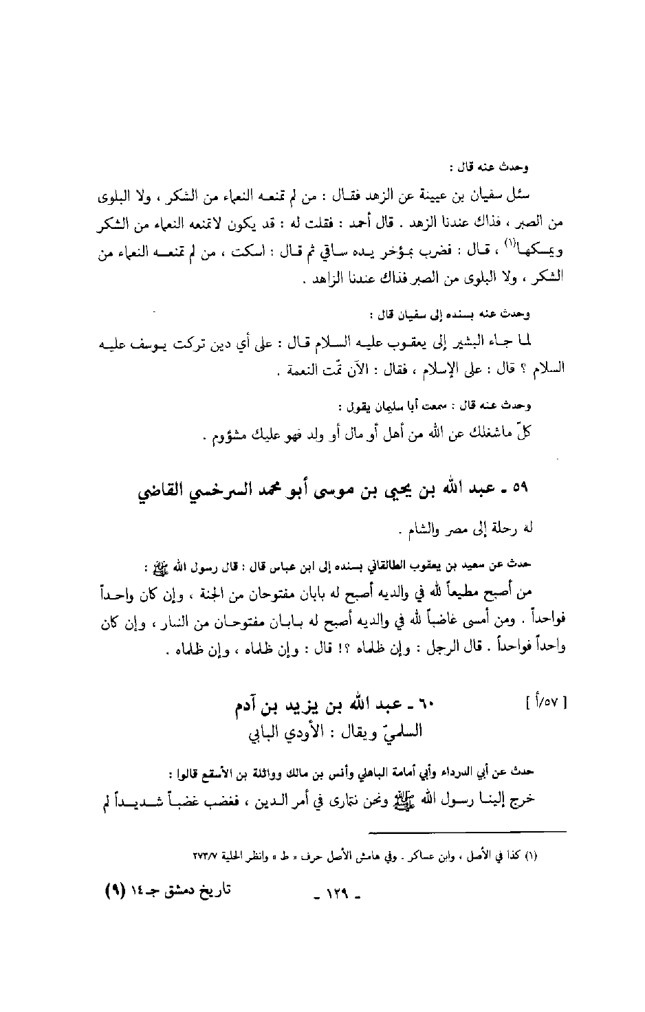 حدث عن سعيد بن يعقوب الطالقاني بسنده إلى ابن عباس قال: قال رسول الله صَلَّى اللهُ عَلَيْهِ وَسَلَّمَ: من أصبح مطيعاً لله في والديه أصبح له بابان مفتوحان من الجنة، وإن كان واحداً فواحداً. ومن أمسى غاضباً لله في والديه أصبح له بابان مفتوحان من النار، وإن كان واحداً فواحداً. قال الرجال: وإن ظلماه؟! قال: وإن ظلماه، وإن ظلماه.
