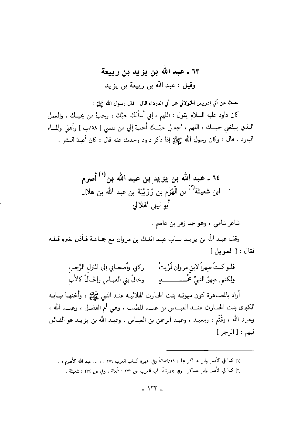 وقيل: عبد الله بن ربيعة بن يزيد حدث عن أبي إدريس الخولاني عن أبي الدرداء قال: قال رسول الله صَلَّى اللهُ عَلَيْهِ وَسَلَّمَ: كان داود عليه السلام يقول: اللهم إني أسألك حبك، وحب من يحبك، والعمل الذي يبلغني حبك، اللهم، اجعل حبك أحب إلي من نفسي وأهلي والماء البارد. قال: وكان رسول الله صَلَّى اللهُ عَلَيْهِ وَسَلَّمَ إذا ذكر داود وحدث عنه قال: كان أعبد البشر.