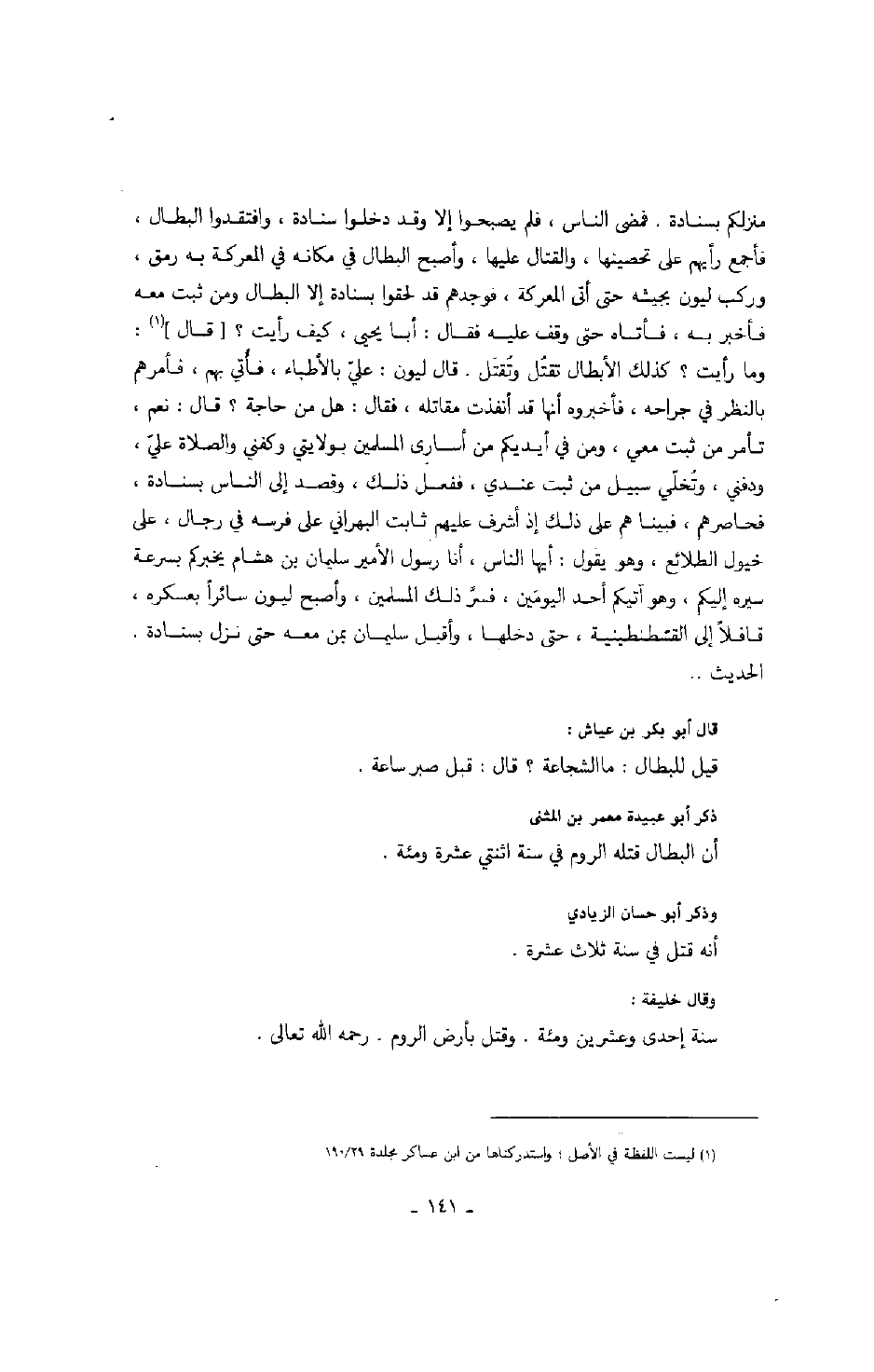 منزلكم بسنادة. فمضى الناس، فلم يصبحوا إلا وقد دخلوا سنادة، وافتقدوا البطال، فأجمع رأيهم على تحصينها، والقتال عليها، وأصبح البطال في مكانه في المعركة به رمق، وركب ليون بجيشه حتى أتى المعركة، فوجدهم قد لحقوا بسنادة إلا البطال ومن ثبت معه فأخبر به، فأتاه حتى وقف عليه فقال: أبا يحيى، كيف رأيت؟ قال: وما رأيت؟ كذلك الأبطال تقتل وتقتل. قال ليون: علي بالأطباء، فأتي بهم، فأمرهم بالنظر في جراحه، فأخبروه أنها قد أنفذت مقاتله، فقال: هل من حاجة؟ قال: نعم، تأمر من ثبت معي، ومن في أيديكم من أسارى المسلمين بولايتي وكفني والصَلَّى اللهُ عَلَيْهِ وَسَلَّمَى الله عليه وسلمى الله عليه وسلماة علي، ودفني، وتخلى سبيل من ثبت عندي، ففعل ذلك، وقصد إلى الناس بسنادة فحاصرهم، فبينا هم على ذلك إذ أشرف عليهم ثابت البهراني على فرسه في رجال، على خيول الطلائع، وهو يقول: أيها الناس، أنا رسول الأمير سليمان بن هشام يخبركم بسرعة سيره إليكم، وهو آتيكم أحد اليومين، فسر ذلك المسلمين، وأصبح ليون سائراً بعسكره، قافلاً إلى القسطنطسنية، حتى دخلها، واقبل سليمان بمن معه حتى نزل بسنادة. الحديث..