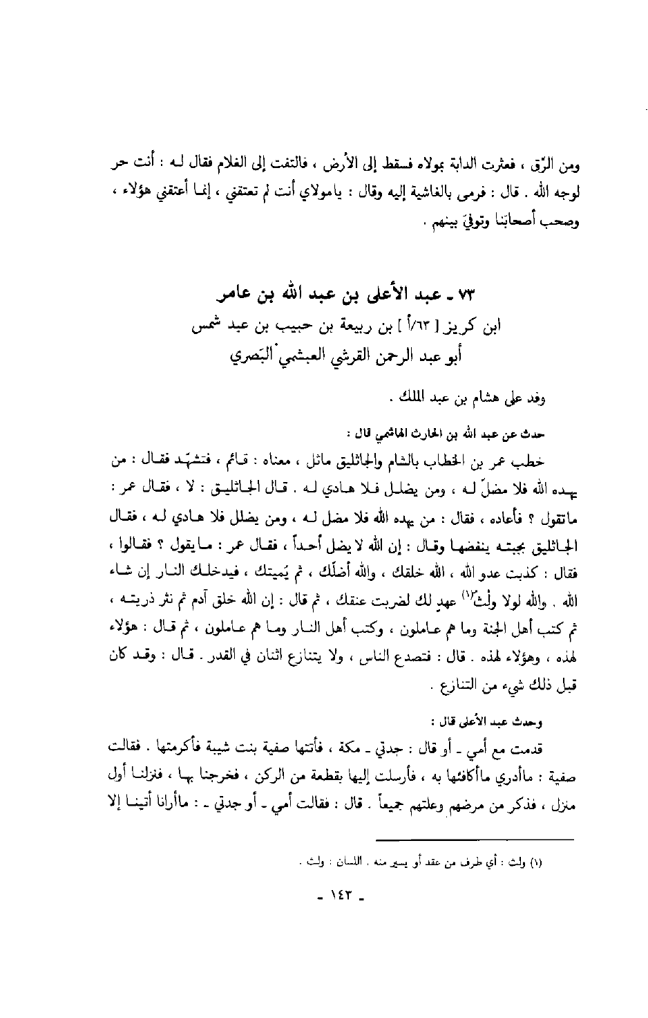 حدث عن عبد الله بن الحارث الهاشمي قال: خطب عمر بن الخطاب بالشام والجاثليق ماثل، معناه: قائم، فتشهد فقال: من يهده الله فلا مضل له، ومن يضلل فلا هادي له. قال الجاثليق: لا، فقال عمر: ما تقول؟ فأعاده، فقال: من يهده الله فلا مضل له، ومن يضلل فلا هادي له، فقال الجاثليق بجبته ينفضها وقال: إن الله لا يضل أحداً، فقال عمر: ما يقول؟ فقالوا، فقال: كذبت عدو الله، الله خلقك، والله أضلك، ثم يميتك، فيدخلك النار إن شاء الله. والله لولا ولث عهدٍ لك لضربت عنقك، ثم قال: إن الله خلق آدم ثم نثر ذريته، ثم كتب أهل الجنة وما هم عاملون، وكتب اهل النار وما هم عاملون، ثم قال: هؤلاء لهذه، وهؤلاء لهذه. قال: فتصدع الناس، ولا يتنازع اثنان في القدر. قال: وقد كان قبل ذلك شيء من التنازع.
