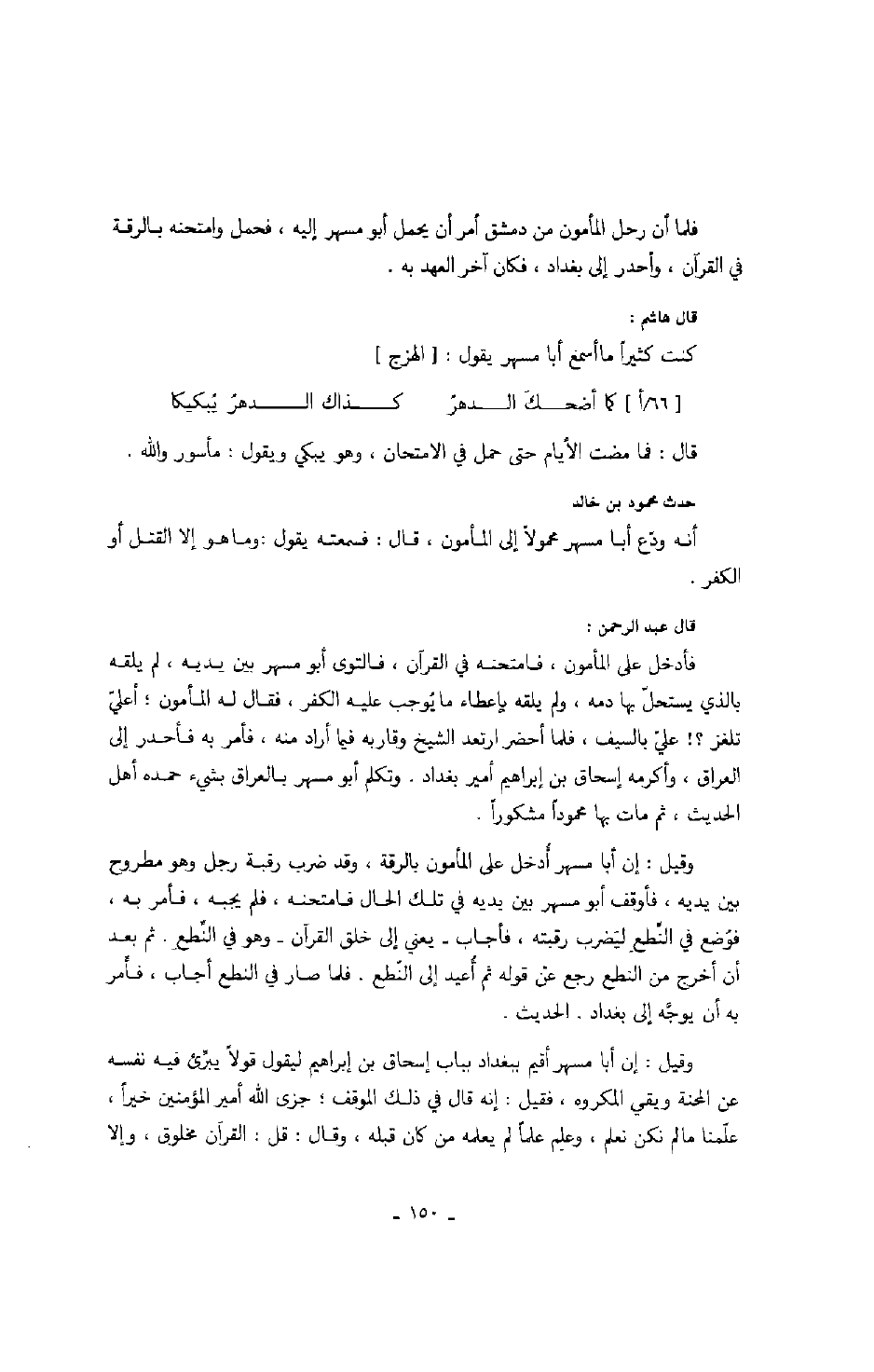 وقيل: إن أبا مسهر أقيم ببغداد بباب إسحاق بن إبراهيم ليقول قولاً يبرئ فيه نفسه عن المحنة ويقي المكروه، فقيل: إنه قال في ذلك الموقف؛ جزى الله أمير المؤمنين خيراً، علمنا مالم نكن نعلم، وعلم علماً لم يعلمه من كان قبله، وقال: قل: القرآن مخلوق، وإلا