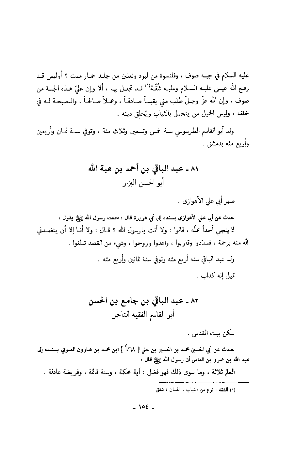 حدث عن أبي الحسين محمد بن الحسين بن علي ابن محمد بن هارون الصوفي بسنده إلى عبد الله بن عمرو بن العاص أن رسول الله صَلَّى اللهُ عَلَيْهِ وَسَلَّمَ قال: العلم ثلاثة، وما سوى ذلك فهو فضل: آية محكمة، وسنة قائمة، وفريضة عادلة.