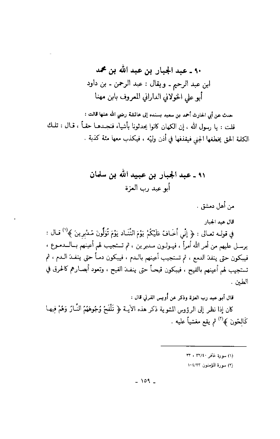 قال عبد الجبار في قوله تعالى: " إني أخاف عليكم يوم التناد يوم تولون مدبرين " قال: يرسل عليهم من أمر الله أمراً، فيولون مدبرين، ثم تستجيب لهم أعينهم بالدموع، فيبكون حتى ينفد الدمع، ثم تستجيب أعينهم بالدم، فيبكون دماً حتى ينفذ الدم، ثم تستجيب لهم أعينهم بالقيح، فيبكون قيحاً حتى ينفذ القيح، وتعود أبصارهم كالحرق في الطين.