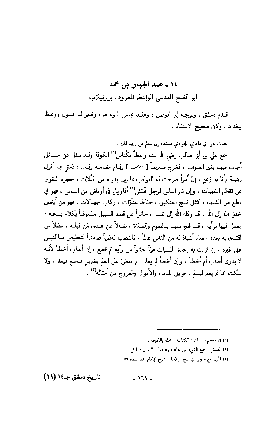 حدث عن أبي المعالي الجويني بسنده إلى سالم بن زيد قال: سمع علي بن أبي طالب رضي الله عنه واعظاً بكناس الكوفة وقد سئل عن مسائل أجاب فيها بغير الصواب، فخرج مسرعاً وقام مقامه وقال: ذمتي بما اقول رهينة وأنا به زعيم، إن أمرأ صرحت له العواقب بما بين يديه من المثلات، حجزه التقوى عن تقحم الشبهات، وإن شر الناس لرجل قمش أقاويل في أوباش من الناس، فهو في قطع من الشبهات كمثل نسج العنكبوت خباط عشوات، ركاب جهالات، فهو من أبغض خلق الله إلى الله، قد وكله الله إلى نفسه، جائراً عن قصد السبيل مشغوفاً بكلام بدعة، يعمل فيها برأيه، قد لهج منها بالصوم والصلاة، ضالاً عن هدى من قبله، مضلاً لمن اقتدى به بعده، سماه أشباه له من الناس عالماً، فانتصب قاضياً ضامناً لتخليص ما التبس على غيره، إن نزلت به إحدى المبهات هيأ حشواً من رأيه ثم قطع، إن أصاب أخطأ لأنه لا يدري أصاب أم أخطأ، وإن أخطأ لم يعلم، لم يعض على العلم بضرسٍ قاطع فيعلم، ولا سكت عما لم يعلم ليسلم، فويل للدماء والأموال والفروج من أمثاله.