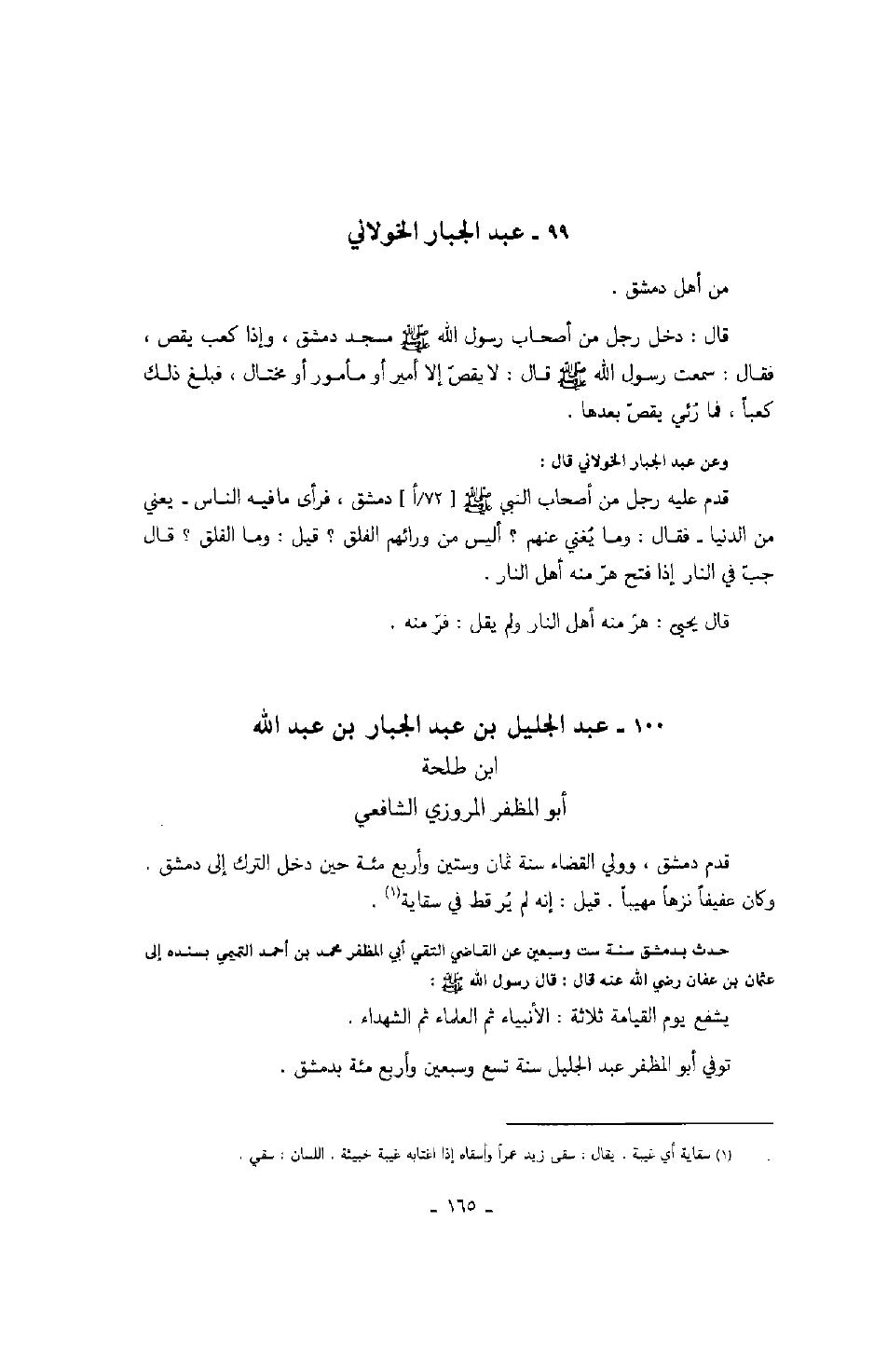 قال: دخل رجل من أصحاب رسول الله صَلَّى اللهُ عَلَيْهِ وَسَلَّمَ مسجد دمشق، وإذا كعب يقص، فقال: سمعت رسول الله صَلَّى اللهُ عَلَيْهِ وَسَلَّمَ قال: لا يقص إلا أمير أو مأمور أو مختال، فبلغ ذلك كعباً، فما رئي يقص بعدها.