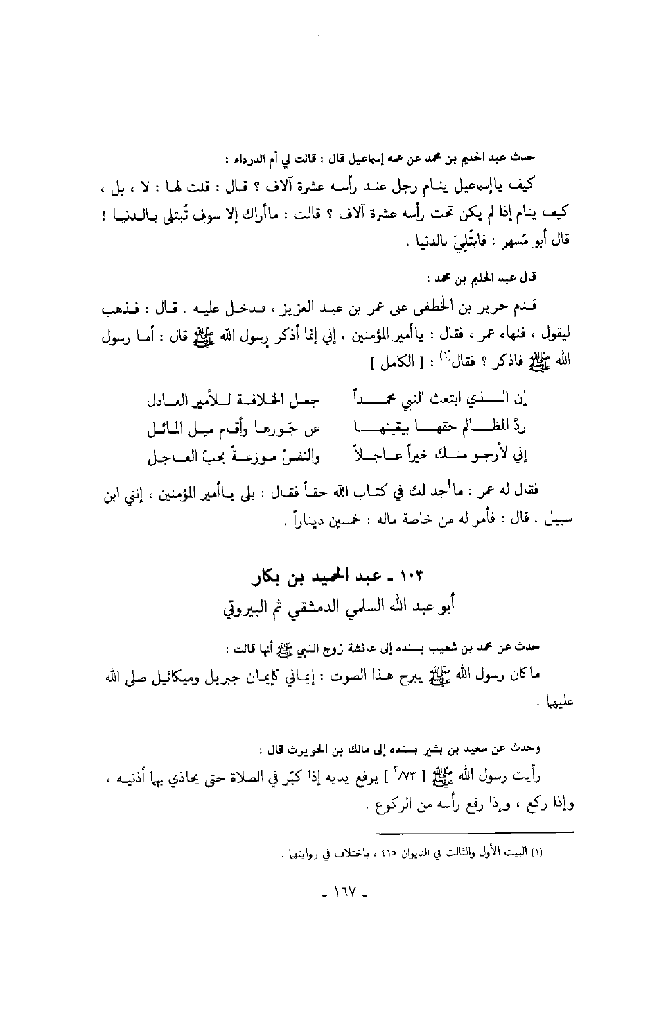 قال عبد الحليم بن محمد: قدم جرير بن الخطفى على عمر بن عبد العزيز، فدخل عليه. قال: فذهب ليقول، فنهاه عمر، فقال: يا أمير المؤمنين، إني إنما أذكر رسول الله صَلَّى اللهُ عَلَيْهِ وَسَلَّمَ قال: أما رسول الله صَلَّى اللهُ عَلَيْهِ وَسَلَّمَ فاذكر؟ فقال: الكامل
