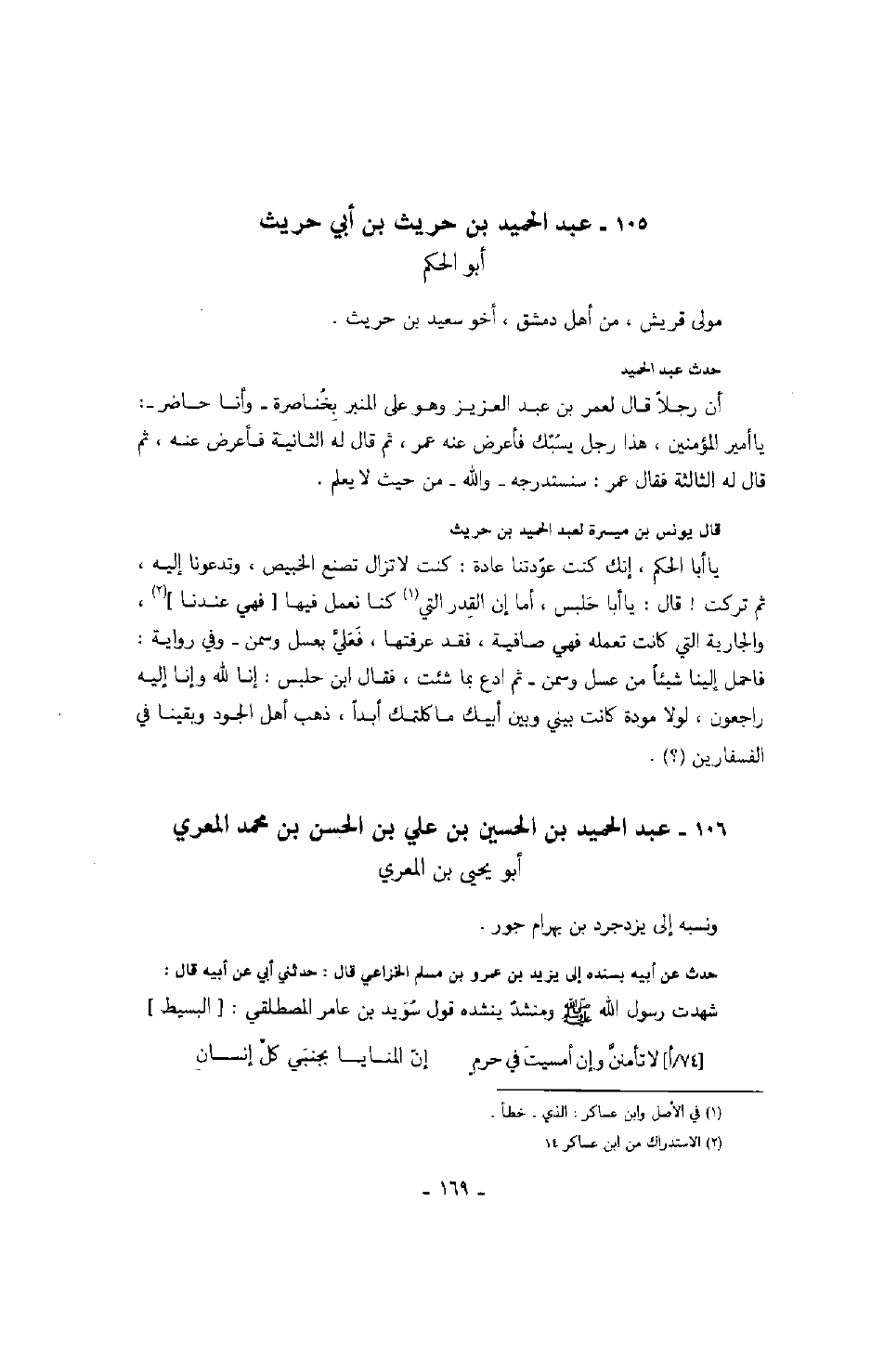أبو الحكم مولى قريش، من أهل دمشق، أخو سعيد بن حريث حدث عبد الحميد أن رجلاً قال لعمر بن عبد العزيز وهو على المنبر بخناصرة - وأنا حاضر -: يا أمير المؤمنين، هذا رجل يسبك فأعرض عنه عمر، ثم قال له الثانية فأعرض عنه، ثم قال له الثالثة فقال عمر: سنستدرجه - والله - من حيث لا يعلم.