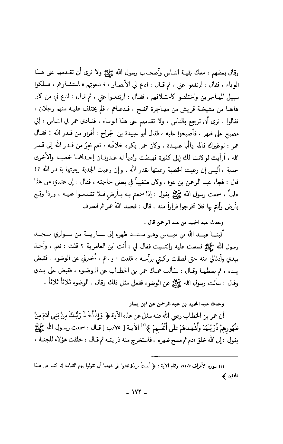 وقال بعضهم: معك بقية الناس وأصحاب رسول الله صَلَّى اللهُ عَلَيْهِ وَسَلَّمَ ولا نرى أن تقدمهم على هذا الوباء، فقال: ارتفعوا عني، ثم قال: ادع لي الأنصار، فدعوتهم فاستشارهم، فسلكوا سبيل المهاجرين واختلفوا كاختلافهم، فقال: ارتفعوا عني، ثم قال: ادع لي من كان ها هنا من مشيخة قريش من مهاجرة الفتح، فدعاهم، فلم يختلف عليه منهم رجلان، فقالوا: نرى أن ترجع بالناس، ولا تقدمهم على هذا الوباء، فنادى عمر في الناس: إني مصبح على ظهر، فأصبحوا عليه، فقال أبو عبيدة بن الجراح: أفرار من قدر الله! فقال عمر: لو غيرك قالها يا أبا عبيدة، وكان عمر يكره خلافه، نعم نفر من قدر الله إلى قدر الله، أرأيت لو كانت لك إبل كثيرة فهبطت وادياً له عدوتان إحداهما خصبة والأخرى جدبة، أليس إن رعيت الخصبة رعيتها بقدر الله، وإن رعيت الجدبة رعيتها بقدر الله؟ قال: فجاء عبد الرحمن بن عوف وكان متغيباً في بعض حاجته، قفال: إن عندي من هذا علماً، سمعت رسول الله صَلَّى اللهُ عَلَيْهِ وَسَلَّمَ يقول: إذا سمعتم به بأرضٍ فلا تقدموا عليه، وإذا وقع بأرض وأنتم بها فلا تخرجوا فراراً منه. قال: فحمد الله عمر ثم انصرف.