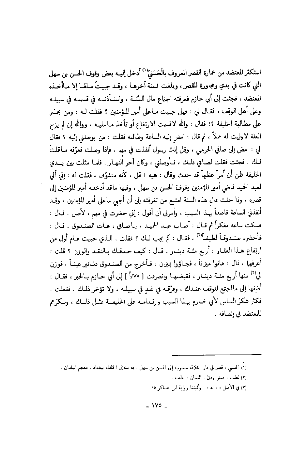 استكثر المعتضد من عمارة القصر المعروف بالحسني أدخل إليه بعض وقوف الحسن بن سهل التي كانت في يدي ومجاورة للقصر، وبلغت السنة آخرها، وقد حببت مالها إلا ما أخذه المعتضد، فجئت إلى أبي خازم فعرفته اجتماع مال السنة، واستأذنته في قسمته في سبيله وعلى أهل الموقف، فقال لي: فهل جبيت ما على أمير المؤمنين؟ فقلت له: ومن يجسر على مطالبة الخليفة؟! فقال: والله لا قسمت الراتفاع أو تأخذ ما عليه، والله إن لم يزح العلة لا وليت له عملاً، ثم قال: امض إليه الساعة وطالبه فقلت: من يوصلني إليه؟ فقال لي: امض إلى صافي الحرمي، وقل إنك رسول أنفذت في مهم، فإذا وصلت فعرفه ما قلتلك. فجئت فقلت لصافي ذلك، فأوصلني، وكان آخر النهار. فلما مثلت بين يدي الخليفة ظن أن أمراً عظيماً قد حدث وقال: هيه! قل، كأنه متشوف، فقلت له: إني ألي لعبد الحميد قاضي أمير المؤمنين وقوف الحسن بن سهل، وفيها ما قد أدخله أمير المؤمنين إلى قصره، ولما جئت بمال هذه السنة امتنع من تفرقته إلى أن أجبي ما على أمير المؤمنين، وقد أنفذني الساعة قاصداً بهذا السبب، وأمرني أن أقول: إني حضرت في مهم، لأصل. فسكت ساعة مفكراً لم قال: أصاب عبد الحميد، يا صافي، هات الصندوق. قال: فأحضره صندوقاً لطيفاً، فقال: كم يجب لك؟ فقلت: الذي جبيت عام أول من ارتفاع هذا العقار: أربع مئة دينار. قال: كيف حذقك بالنقد والوزن؟ قلت: أعرفهما، قال: هاتوا ميزاناً، فجاؤوا بميزان، فأخرج من الصندوق دنانير عيناً، فوزن لي منها أربع مئة دينار، فقبضتها وانصرفت إلى أبي خازم بالخبر، فقال: أضفها إلى ما اجتمع للوقف عندك، وفرقه في غدٍ في سبيله، ولا تؤخر ذلك، ففعلت. فكثر شكر الناس لأبي خازم بهذا السبب وإقدامه على الخليفة بمثل ذلك، وشكرهم للمعتضد في إنصافه.