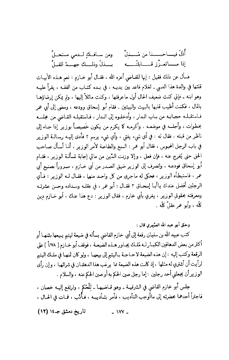 فسأل عن ذلك فقيل: إنها للقاضي أعزه الله، فقال أبو خازم: نعم هذه الأبيات قلتها في والدة هذا الصبي - لغلام قاعد بين يديه، في يده كتاب من الفقه، يقرأ عليه وهو ابنه - فإني كنت ضعيف الحال أول ما عرفتها، وكنت مائلاً إليها، ولم يمكن إرضاؤها بالمال، فكنت أطيب قلبها بالبيت والبيتين. فقام أبو إسحاق وودعه، ومضى إلى أبي عمر فاستقبله حجابه من باب الدار، وأدخلوه إلى الدار، فاستقبله القاضي من مجلسه بخطوات، وأجلسه في موضعه، وأكرمه كما يكرم من يكون خصيصاً بوزير إذا جاء إلى ناظر من قبله، فقال له: في أي شيء يرسم؟ فأدى إليه رسالة الوزير في باب الرجل المحبوس، فقال أبو عمر: السمع والطاعة لأمر الوزير، أنا أسأل صاحب الحق حتى يفرج عنه، فإن فعل، وإلا وزنت الدين من مالي إجابة لمسألة الوزير، فقام أبو إسحاق فودعه، وانصرف إلى الوزير ضيق الصدر من أبي خازم، مسروراً بصنيع أبي عمر، فاستبطأه الوزير، فحكى له ما جرى من كل واحد منهما، فقال له الوزير: فأي الرجلين أفضل عندك يا أبا إسحاق؟ فقال: أبو عمر، في عقله وسداده وحسن عشرته ومعرفته بحقوق الوزير يغري بأبي حازم: فقال الوزير: دع هذا عنك، أبو خازم دين كله، وأبو عمر عقل كله.