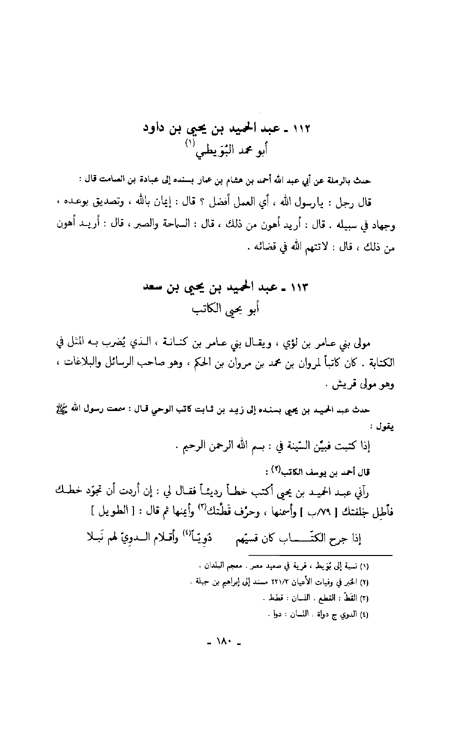 قال أحمد بن يوسف الكاتب: رآني عبد الحميد بن يحيى أكتب خطاً رديئاً فقال لي: إن أردت أن تجود خطك فأطل جلفتك وأسمنها، وحرف قطتك وأيمنها ثم قال: الطويل