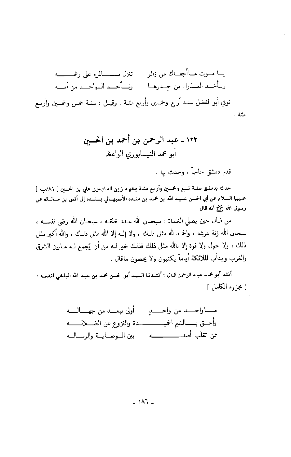 أنشد أبو محمد عبد الرحمن قال: أنشدنا السيد أبو الحسن محمد بن عبد الله البلخي لنفسه: مجزوء الكامل
