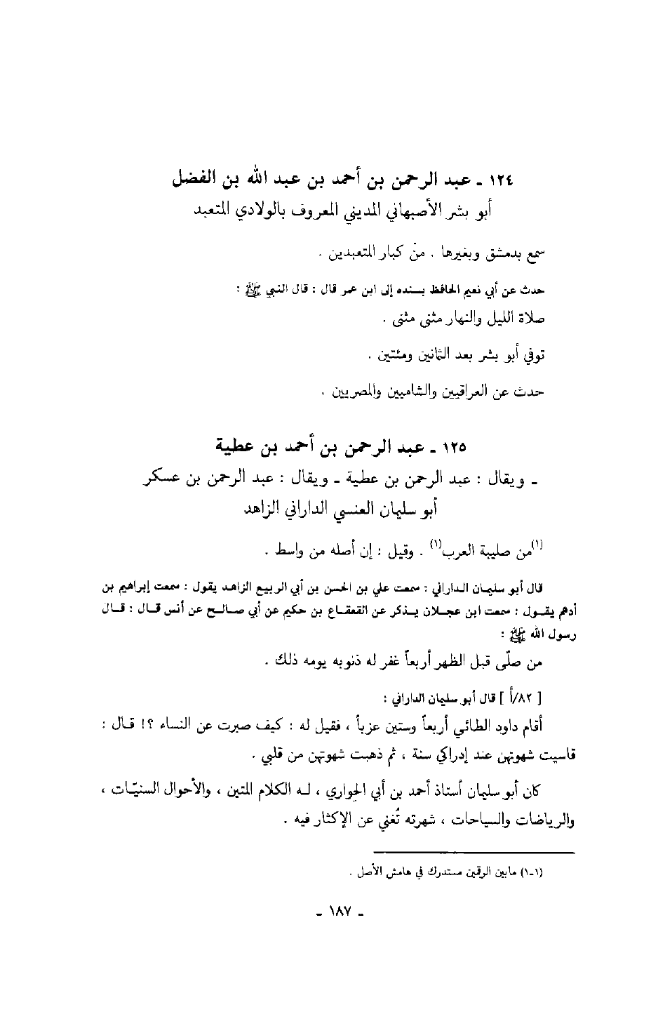 قال أبو سليمان الداراني: سمعت علي بن الحسن بن أبي الربيع الزاهد يقول: سمعت إبراهيم بن أدهم يقول: سمعت ابن عجلان يذكر عن القعقاع بن حكيم عن أبي صالح عن أنس قال: قال رسول الله صَلَّى اللهُ عَلَيْهِ وَسَلَّمَ: من صلى قبل الظهر أربعاً غفر له ذنوبه يومه ذلك قال أبو سليمان الداراني: اقام داود الطائي أربعاً وستين عزباً، فقيل له: كيف صبرت عن النساء؟! قال: قاسيت شهوتهن عند إدراكي سنة، ثم ذهبت شهوتهن من قلبي.