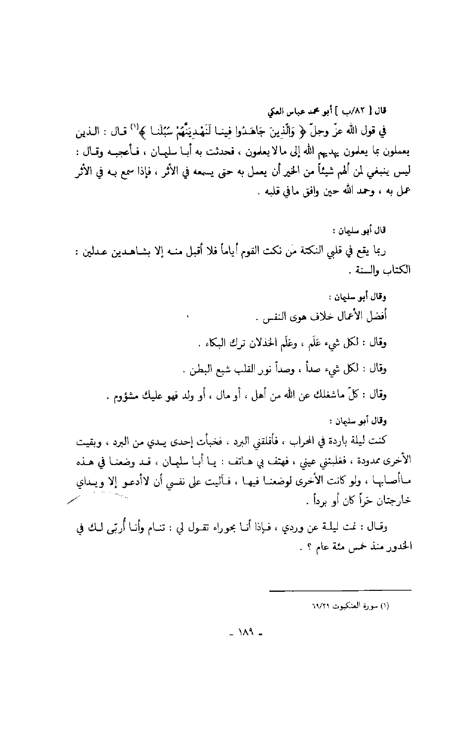أبو محمد عباس العكي في قول الله عز وجل " والذين جاهدوا فينا لنهدينهم سبلنا " قال: الذين يعملون بما يعلمون يهديهم الله إلى ما لا يعلمون، فحدثت به أبا سليمان، فأعجبه وقال: ليس ينبغي لمن ألهم شيئاً من الخير أن يعمل به حتى يسمعه في الآثر، فإذا سمع به في للآثر عمل به، وحمد الله حين وافق ما في قلبه.