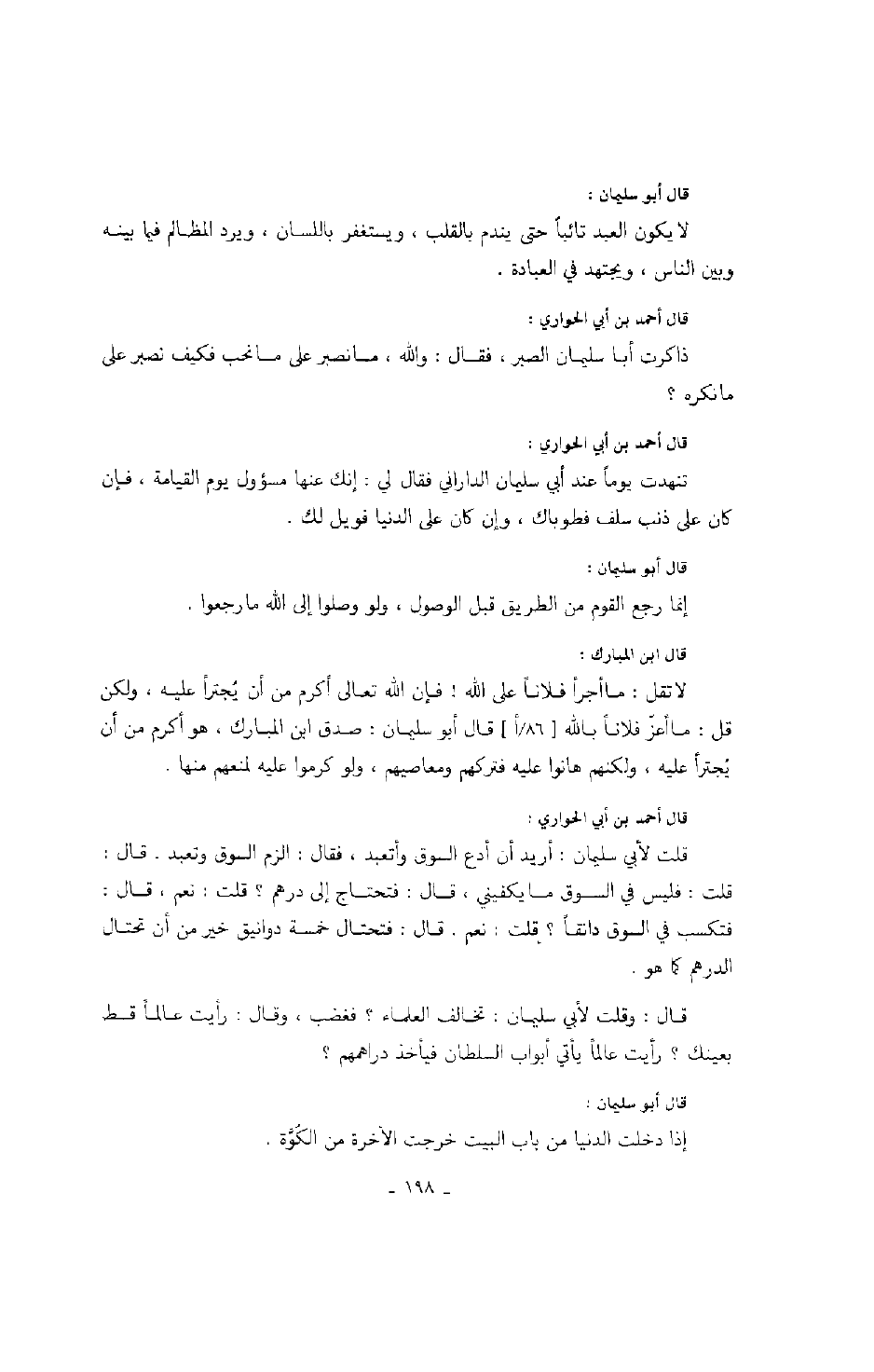 قال: وقلت لأبي سليمان: تخالف العلماء؟ فغضب، وقال: رأيت عالماً قط بعينك؟ رأيت عالماً يأتي أبواب السلطان فيأخذ دراهمهم؟ قال أبو سليمان: إذا دخلت الدنيا من باب البيت خرجت الآخرة من الكوة.