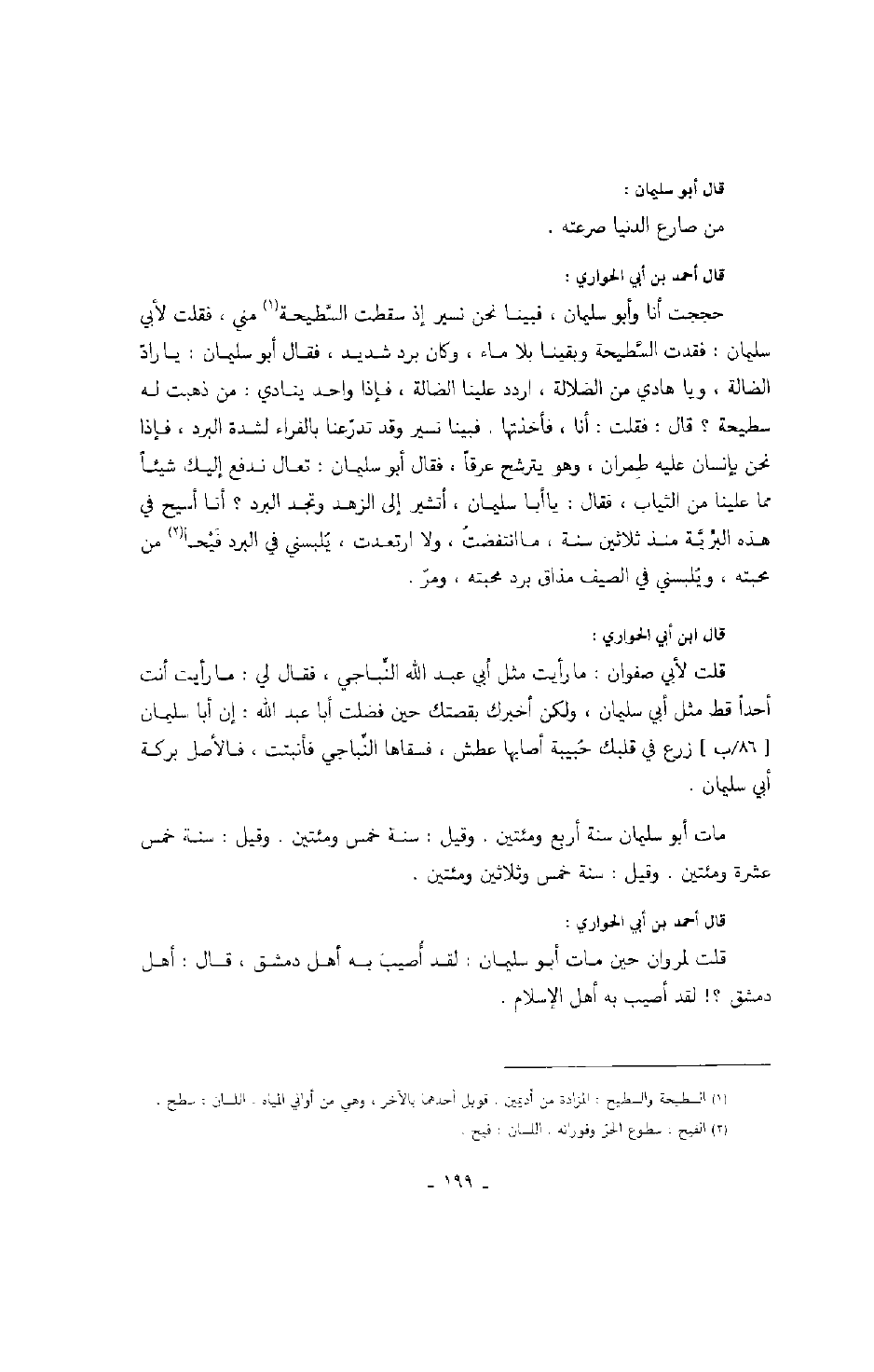 قال احمد بن أبي الحواري: حججت أنا وأبو سليمان، فبينا نحن نسير إذ سقطت السطحية مني، فقلت لأبي سليمان: فقدت السطحية وبقينا بلا ماء، وكان برد شديد، فقال أبو سليمان: يا راد الضالة، ويا هادي من الضلالة، اردد علينا الضالة، فإذا واحد ينادي: من ذهبت له سطحية؟ قال: فقلت: أنا، فأخذتها. فبينا نسير وقد تدرعنا بالفراء لشدة البرد، فإذا نحن بإنسان عليه طمران، وهو يترشح عرقاً، فقال أبو سليمان: تعال ندفع إليك شيئاً مما علينا من الثياب، فقال: يا أبا سليمان، أتشير إلى الزهد وتجد البرد؟ أنا أسيح في هذه البرية منذ ثلاثين سنة، ما انتفضت، ولا ارتعدت، يلبسني في البرد فيحاً من محبته، ويلبسني في الصيف مذاق برد محبته، ومر.