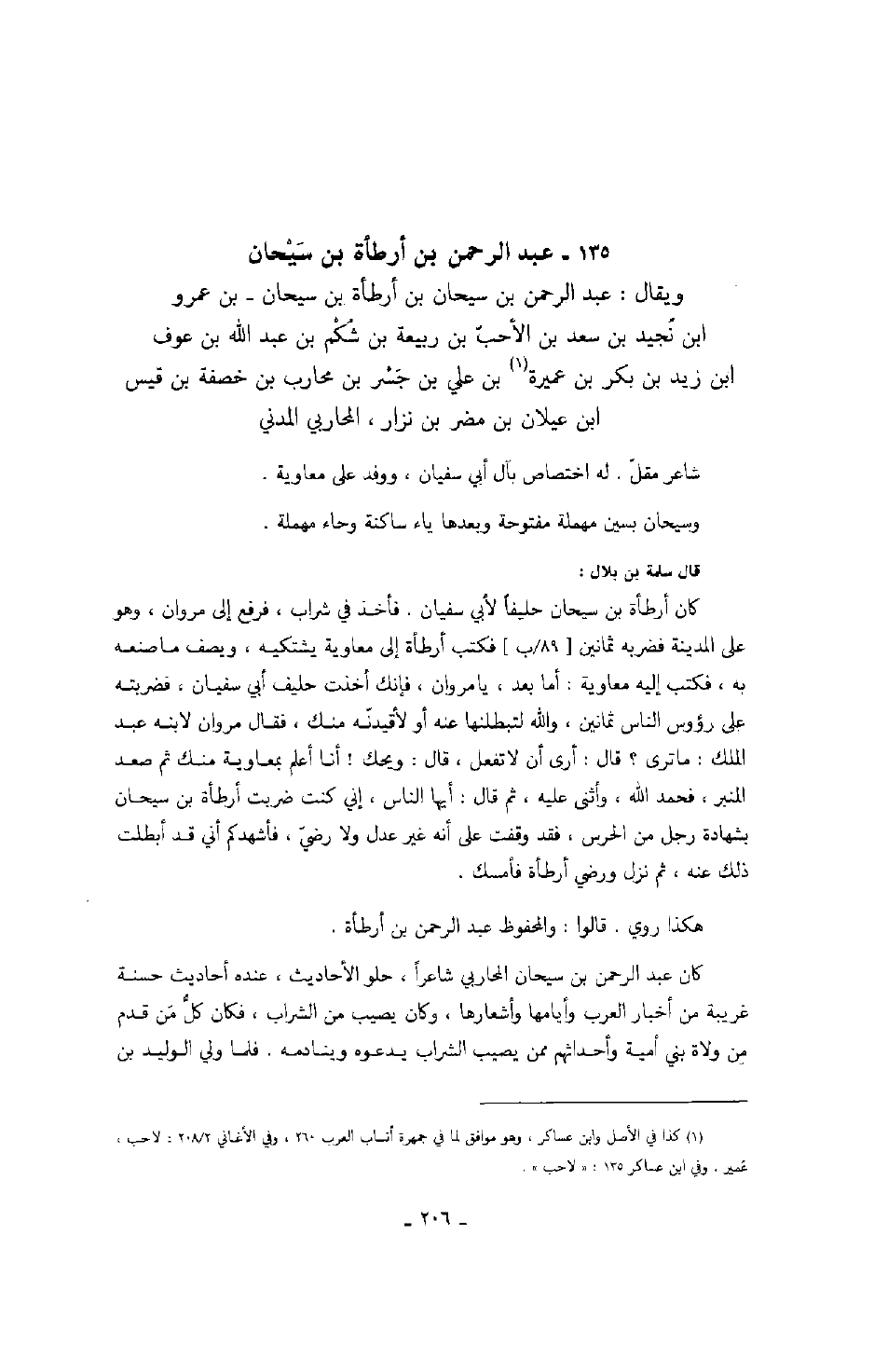 قال سلمة بن بلال: كان أرطأة بن سيحان حليفاً لأبي سفيان. فأخذ في شراب، فرفع إلى مروان، وهو على المدينة فضربه ثمانين فكتب أرطأة إلى معاوية يشتكيه، ويصف ما صنعه به، فكتب إليه معاوية: أما بعد، يا مروان، فإنك أخذت حليف أبي سفيان، فضربته على رؤوس الناس ثمانين، والله لتبطلنها عنه أو لأقيدنه منك، فقال مروان لابنه عبد الملك: ما ترى؟ قال: أرى أن لا تفعل، قال: ويحك! أنا أعلم بمعاوية منك ثم صعد المنبر، فحمد الله، وأثنى عليه، ثم قال: أيها الناس، إني كنت ضربت أرطأة بن سيحان بشهادة رجل من الحرس، فقد وقفت على أنه غير عدل ولا رضي، فأشهدكم أني قد أبطلت ذلك عنه، ثم نزل ورضي أرطأة فأمسك.