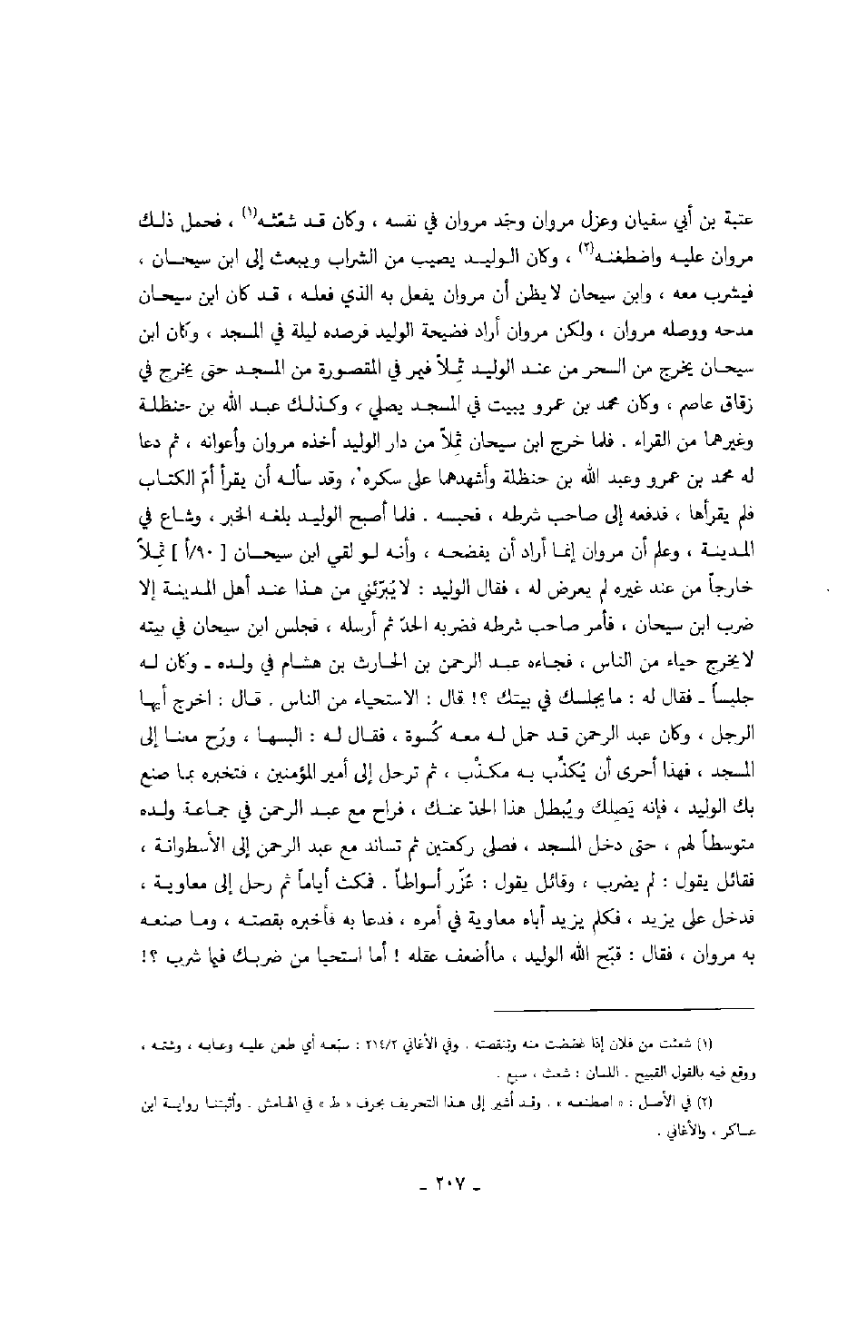 عتبة بن أبي سفيان وعزل مروان وجد مروان في نفسه، وكان قد شعثه، فحمل ذلك مروان عليه واضطغنه، وكان الوليد يصيب من الشراب ويبعث إلى ابن سيحان، فيشرب معه وابن سيحان لا يظن أن مروان يفعل به الذي فعله، قد كان ابن سيحان مدحه ووصله مروان، ولكن مروان أراد فضيحة الوليد فرصده ليلة في المسجد، وكان ابن سيحان يخرج من السحر من عند الوليد ثملاً فيمر في المقصورة من المسجد حتى يخرج في زقاق عاصم، وكان محمد بن عمرو يبيت في المسجد يصلي، وكذلك عبد الله بن حنظلة وغيرهما من القراء. فملا خرج ابن سيحان ثملاً من دار الوليد أخذه مروان وأعوانه، ثم دعا له محمد بن عمرو وعبد الله بن حنظلة وأشهدهما على سكره، وقد سأله أن يقرأ أم الكتاب فلم يقرأها، فدفعه إلى صاحب شرطه، فحبسه. فلما أصبح الوليد بلغه الخبر، وشاع في المدينة، وعلم أن مروان إنما أراد أن يفضحه، وأنه لو لقي ابن سيحان ثملاً خارجاً من عند غيره لم يعرض له، فقال الوليد: لا يبرئني من هذا عند أهل المدينة إلا ضرب ابن سيحان، فأمر صاحب شرطه فضربه الحد ثم أرسله، فجلس ابن سيحان في بيته لا يخرج حياء من الناس، فجاءه عبد الرحمن بن الحارث بن هشام في ولده - وكان له جليساً - فقال له: ما يجلسك في بيتك؟! قال: الاستحياء من الناس. قال: اخرج أيها الرجل، وكان عبد الرحمن قد حمل له معه كسوة، فقال له: البسها، ورح معنا إلى المسجد، فهذا أحرى أن يكذب به مكذب، ثم ترحل إلى أمير المؤمنين، فتخبره بما صنع بك الوليد، فإنه يصلك ويبطل هذا الحد عنك، فراح مع عبد الرحمن في جماعة ولده متوسطاً لهم، حتى دخل المسجد، فصَلَّى اللهُ عَلَيْهِ وَسَلَّمَى الله عليه وسلمى الله عليه وسلمى ركعتين ثم تساند مع عبد الرحمن إلى الأسطوانة، فقائل يقول: لم يضرب، وقائل يقول: عزراً أسواطاً. فمكث أياماً ثم رحل إلى معاوية، فدخل على يزيد، فكلم يزيد، فكلم يزيد أباه معاوية في أمره، فدعا به فأخبره بقصته، وما صنعه به مروان، فقال: قبح الله الوليد، ما اضعف عقله! أما استحيا من ضربك فيما شرب؟!