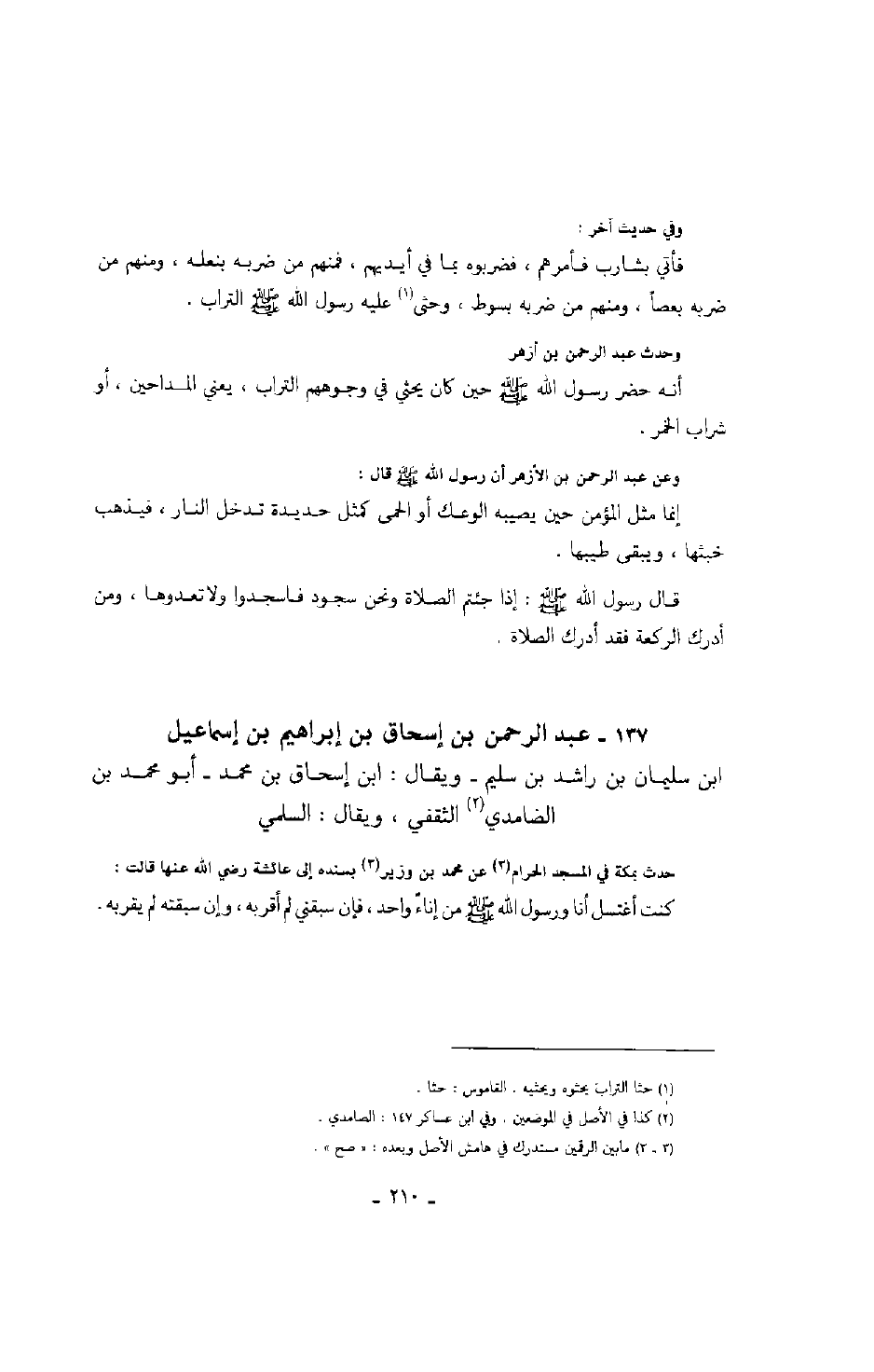 ابن إسماعيل بن سليمان بن راشد بن سليم ويقال: ابن إسحاق بن محمد أبو محمد بن الضامدي الثقفي، ويقال: السلمي حدث بمكة في المسجد الحرام عن محمد بن وزير بسنده إلى عائشة رضي الله عنها قالت: كنت أغتسل أنا ورسول الله صَلَّى اللهُ عَلَيْهِ وَسَلَّمَ من إناء واحد، فإن سبقني لم أقربه، وإن سبقته لم يقربه.