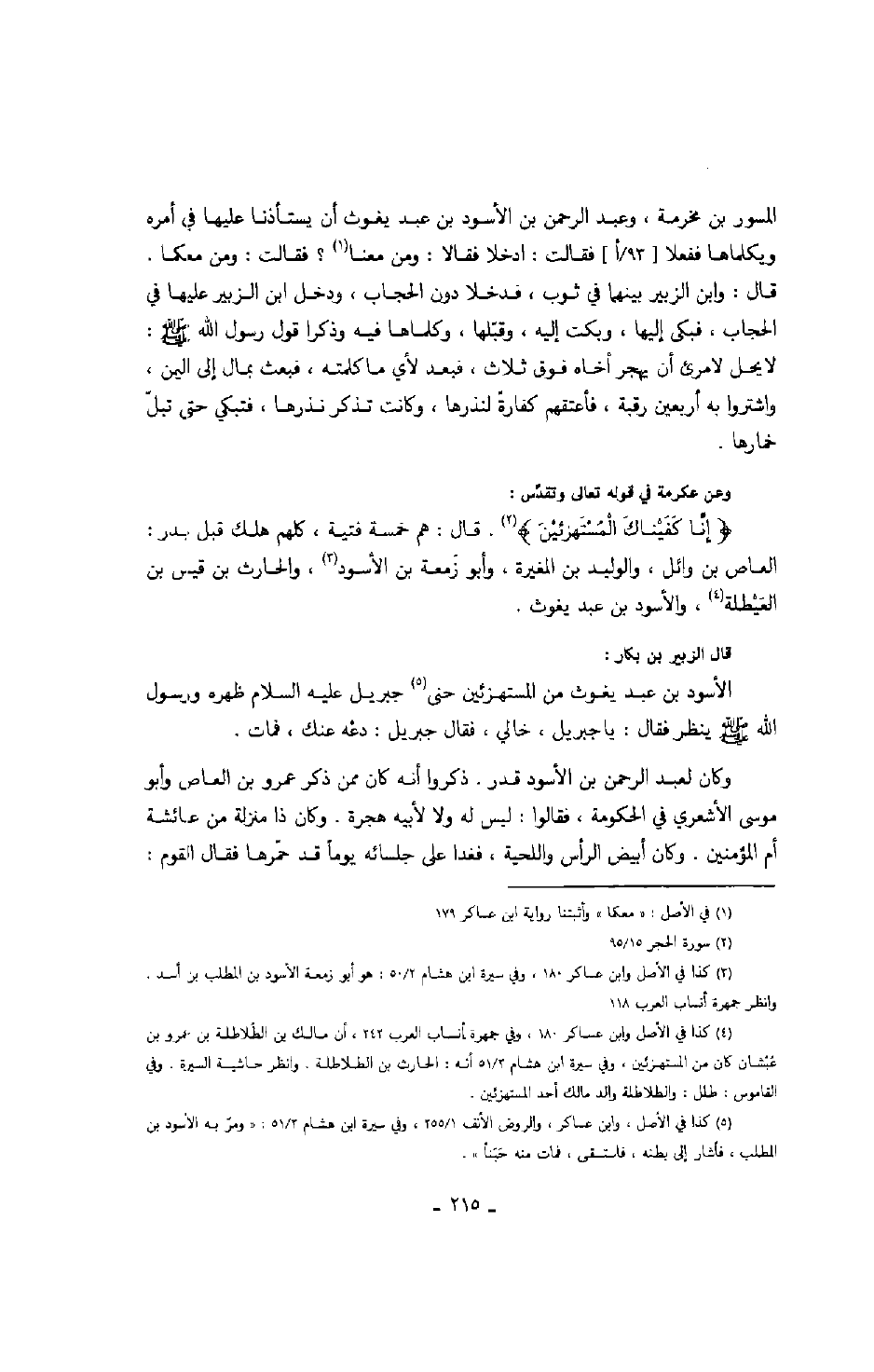 وعن عكرمة في قوله تعالى وتقدس: " إنا كفيناك المستهزئين ". قال: هم خمسة فتية، كلهم هلك قبل بدر: العاص بن وائل. والوليد بن المغيرة، وأبو زمعة بن الأسود، والحارث بن قيس بن العيطلة، والأسود بن عبد يغوث.