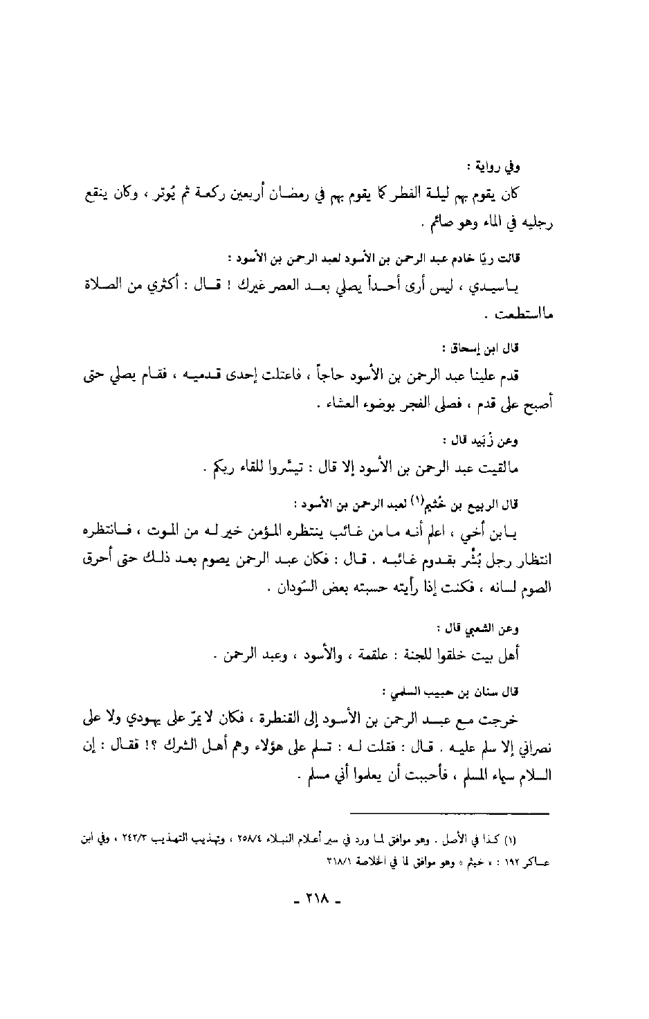 قال ابن إسحاق: قدم علينا عبد الرحمن بن الأسود حاجاً، فاعتلت إحدى قدميه، فقام يصلي حتى أصبح على قدم، فصلى الفجر بوضوء العشاء.