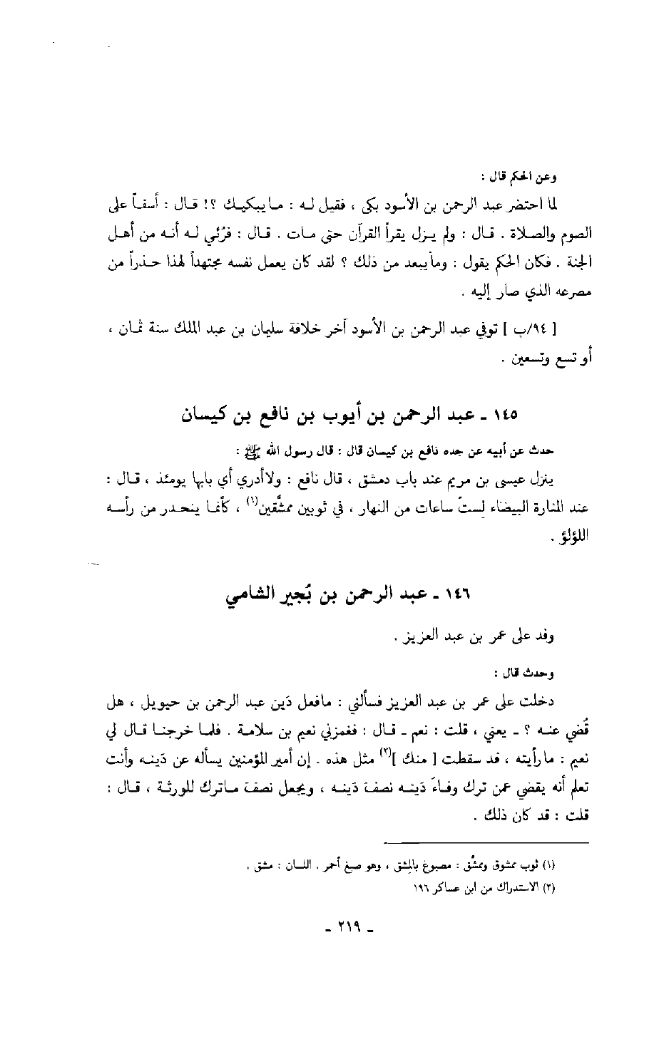 وحدث قال: دخلت على عمر بن عبد العزيز فسألني: ما فعل دين عبد الرحمن بن حيويل، هل قضي عنه؟ - يعني، قلت: نعم - قال: فغمزني نعيم بن سلامة. فلما خرجنا قال لي نعيم: ما رأيته، فد سقطت منك مثل هذه. إن أمير المؤمنين يسأله عن دينه وأنت تعلم أنه يقضي عمن ترك وفاء دينه نصف دينه، ويجعل نصف ما ترك للورثة، قال: قلت: قد كان ذلك.