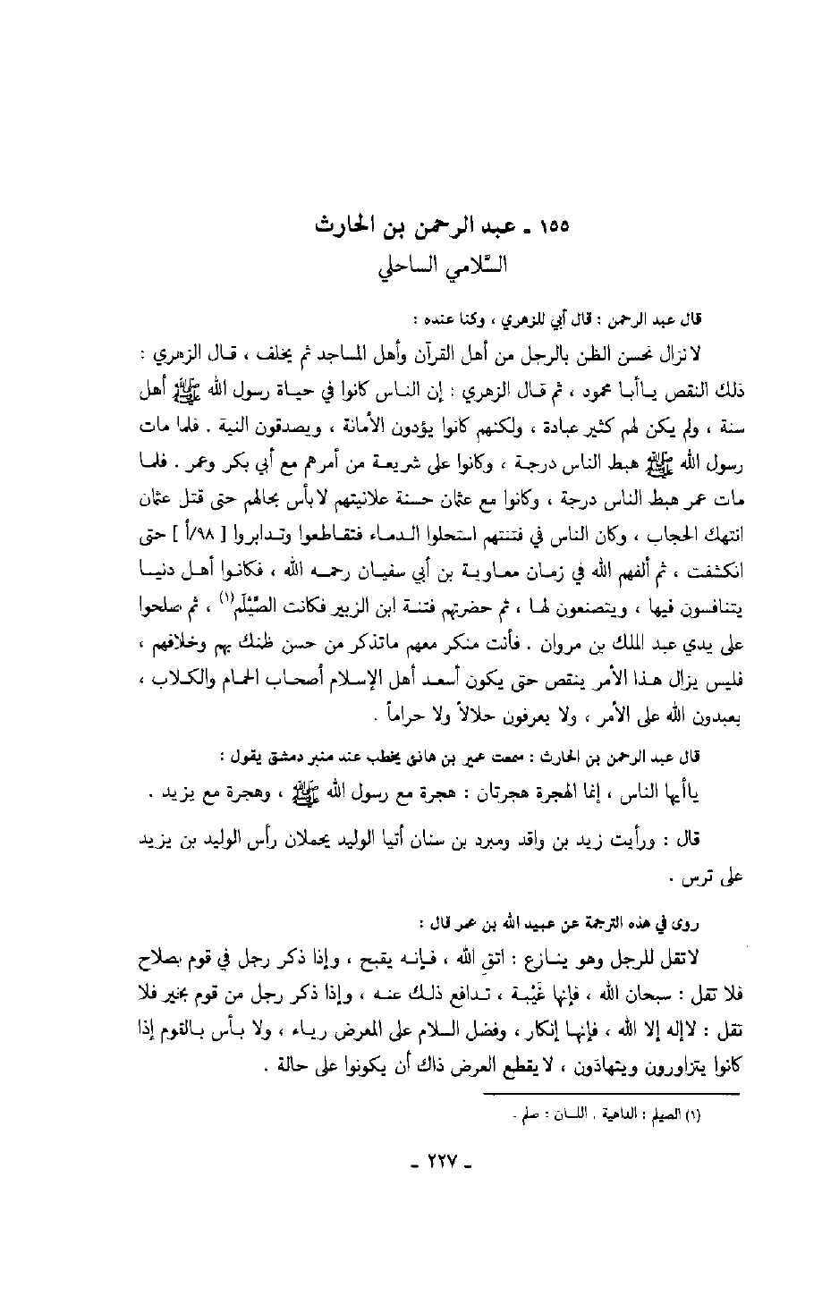 قال عبد الرحمن بن الحارث: سمعت عمير بن هانئ يخطب عند منبر دمشق يقول: يا أيها الناس، إنما الهجرة هجرتان: هجرة مع رسول الله صَلَّى اللهُ عَلَيْهِ وَسَلَّمَ، وهجرة مع يزيد.
